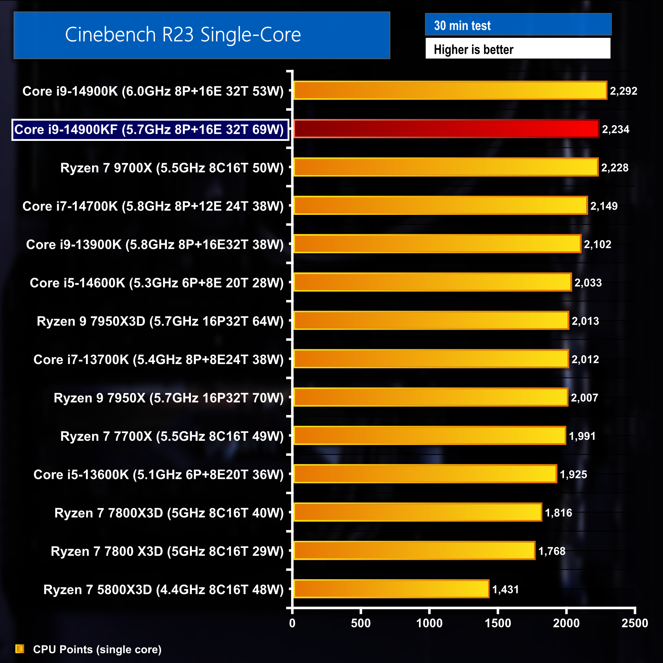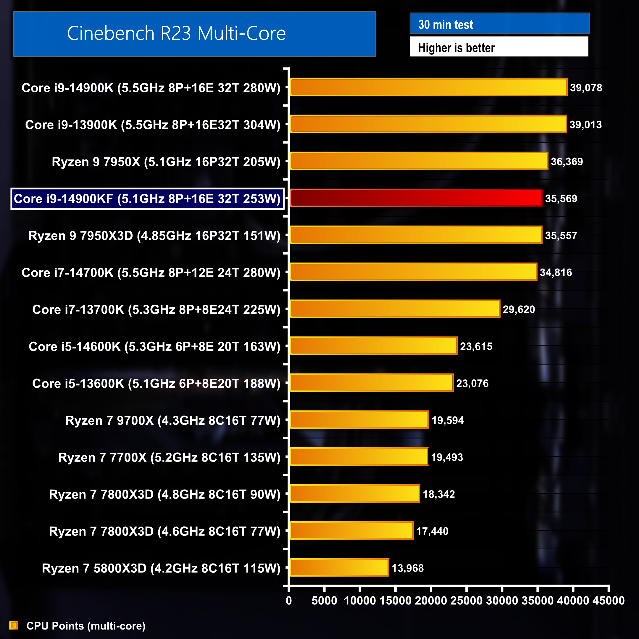 Multicore performance when measured with Cinebench R23 over a sustained 10 minute test saw the Core i9-14900KF land a score of 35,569 points, putting it very close to the AMD Ryzen 9 7950X3D from our comparison data. While this performance is impressive, it fell some way short of the previously tested Intel Core i9-14900K, due to the 14900KF's lower power limit.