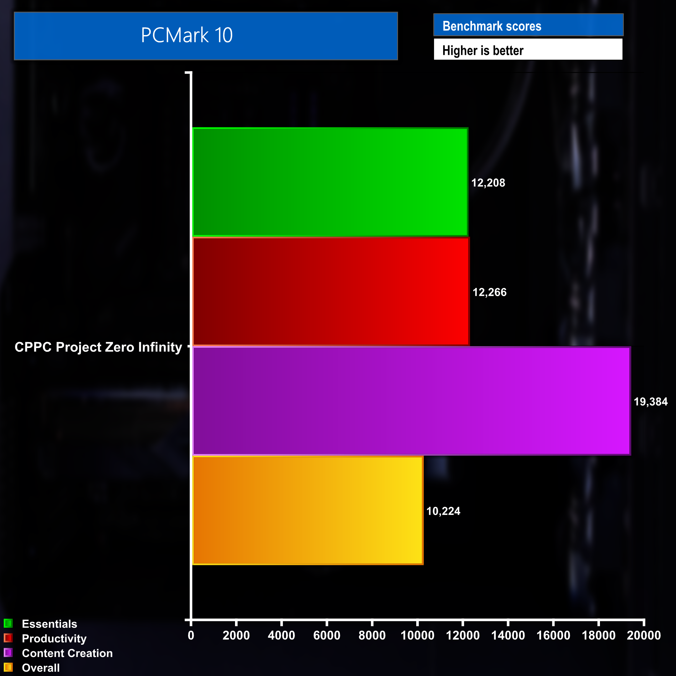 Finally, the PCMark 10 scores highlight the systems overall performance across a variety of differing scenarios. As is the usual with this test, the content creation category is a particular highlight at 19,384 points, thanks to the RTX 4080 Super graphics card found inside the system.