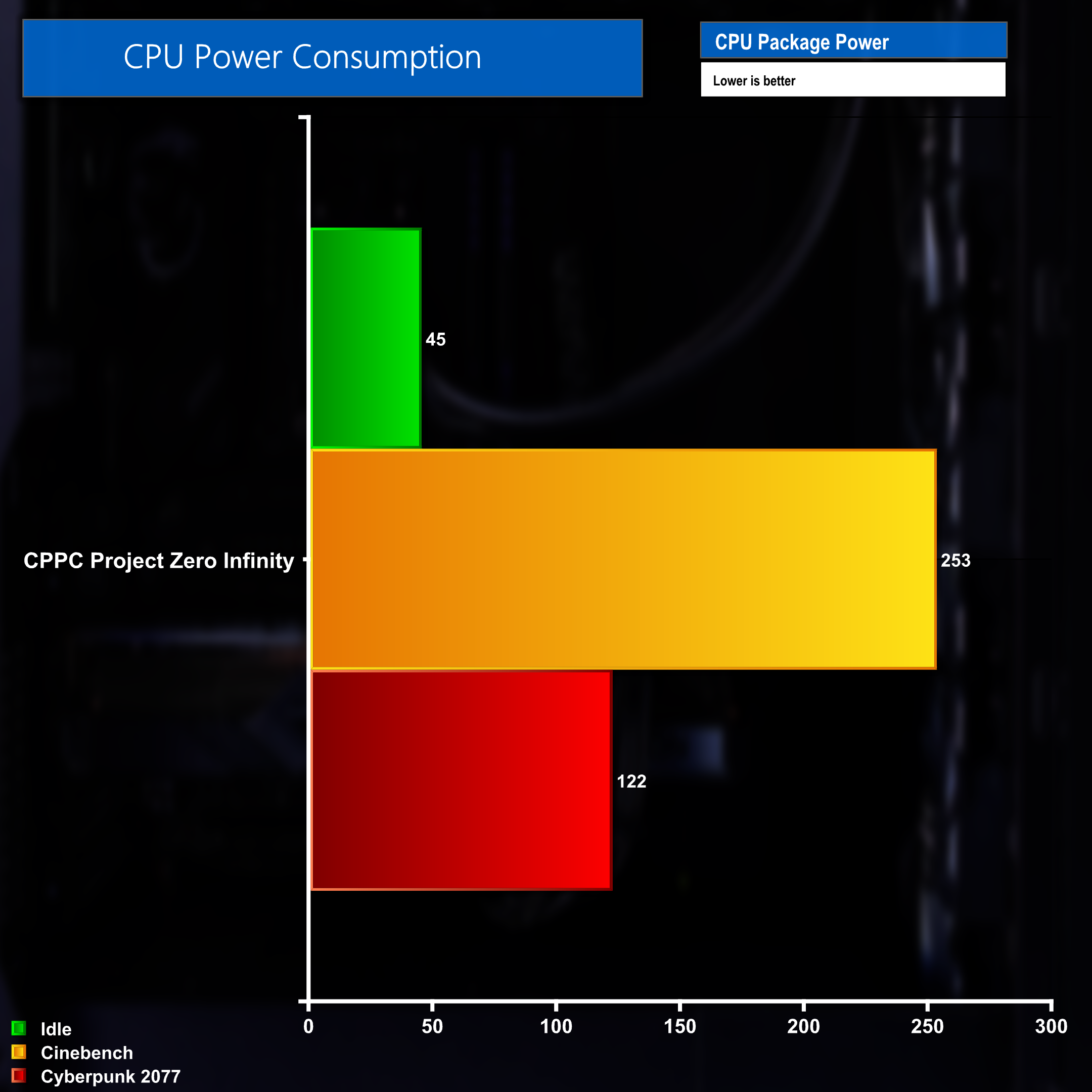 The 14900KF processor found inside the Project Zero Infinity desktop is definitely on the ‘hungrier' side of the processors released in recent times. At idle the CPU package power usage sat around the 45 Watt mark. However, when carrying out a CPU based test like Cinebench, that usage soared to the processor's maximum turbo power limit of 253 Watts. When gaming in Cyberpunk 2077, the 14900KF used just under half of that Cinebench figure, sitting at roughly 122 Watts.