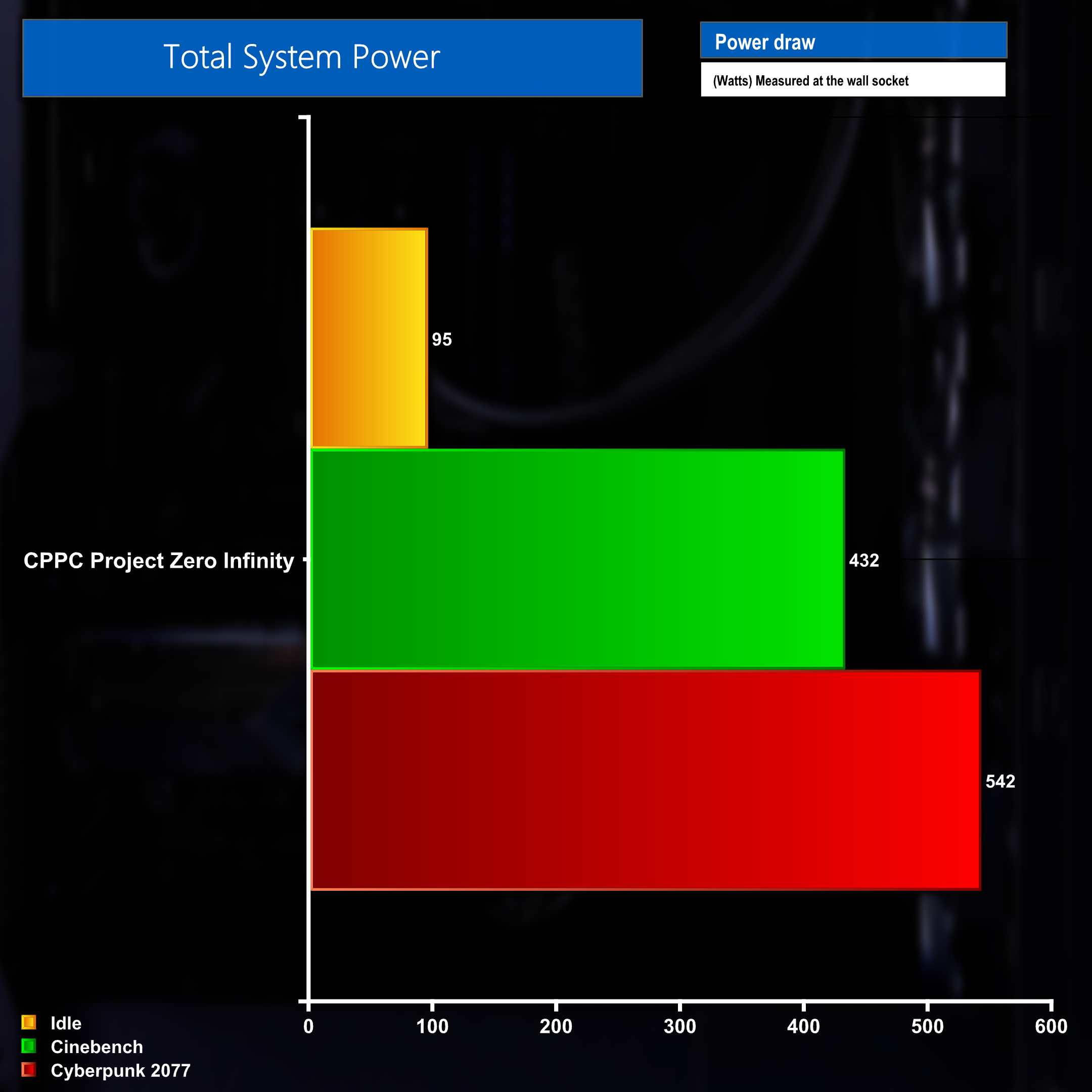 Finally, overall system power usage, when measured at the wall socket, reveals just how power hungry the system is – topping out at a very lofty 542 Watts during a gaming test. Removing a lot of the GPU load from the scenario and running a Cinebench multicore benchmark sees this figure drop to 432 Watts, while the system draws just under 100W at idle.
