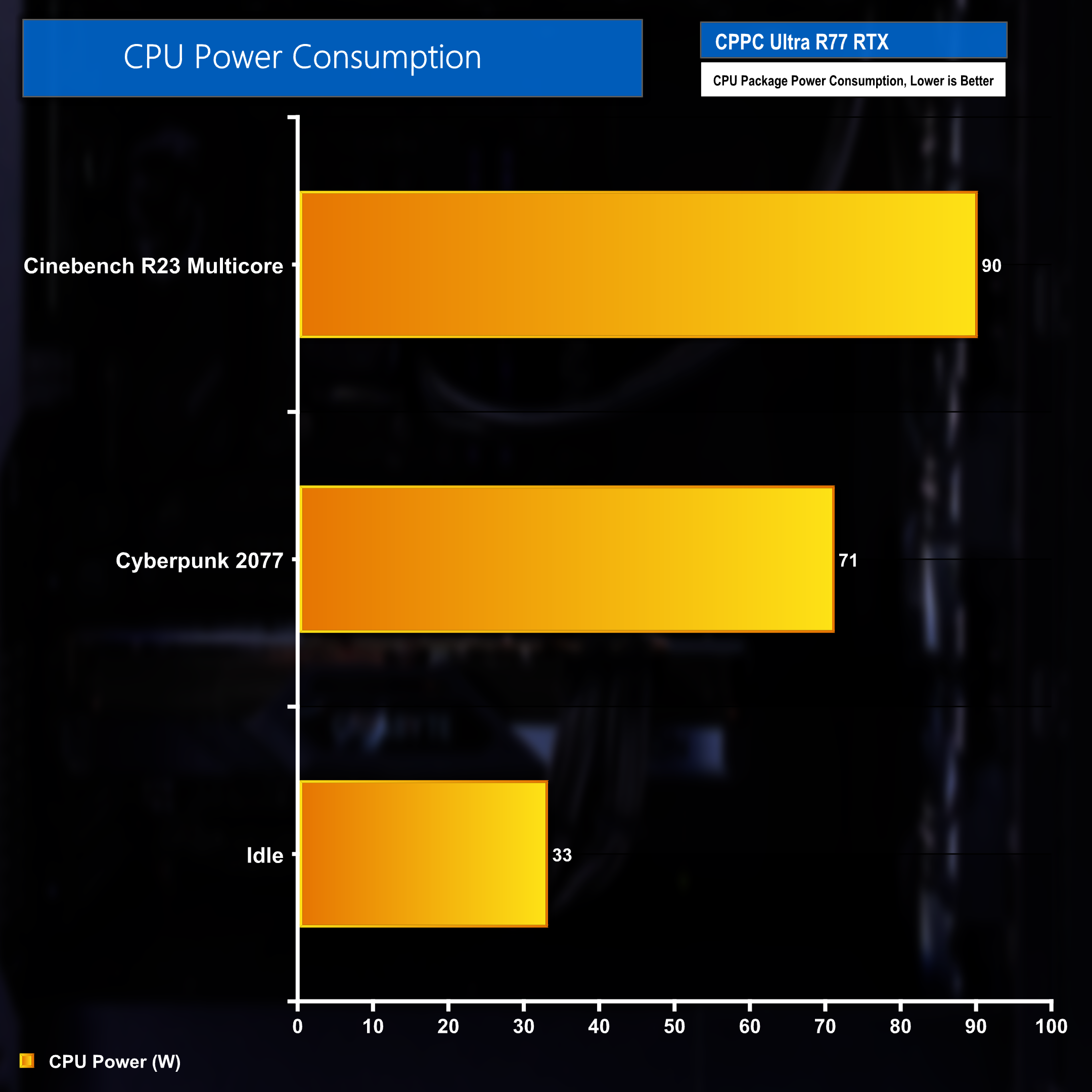 The CPU Package power recordings highlight the power efficiency of Ryzen 7 7800X3D found in the system, with the processor using a sustained 90 watts of power during a Cinebench multicore benchmark.