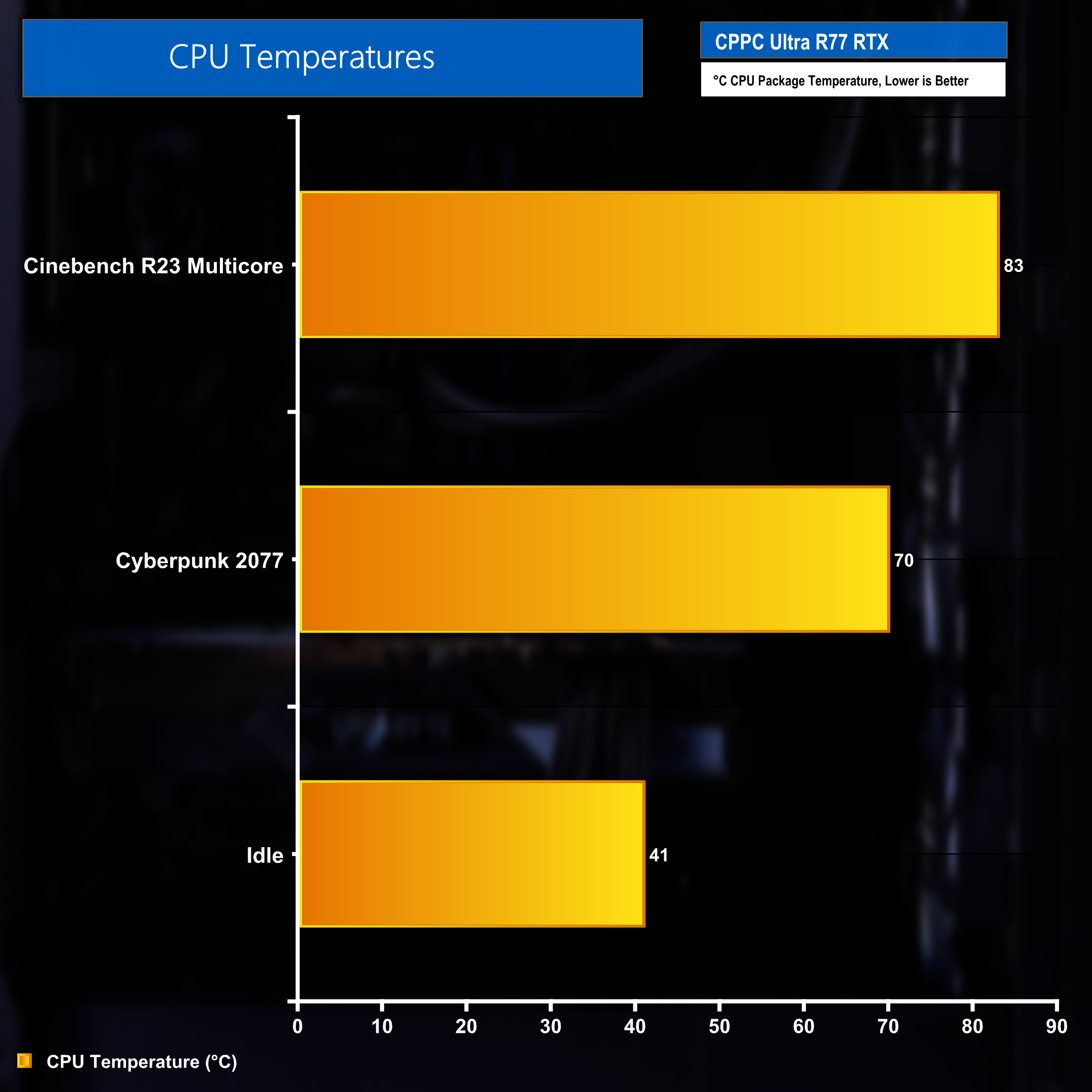 The CPU temperature readings mirror what we saw in the previous power consumption chart, with the processor generating the most heat during a Cinebench run.
