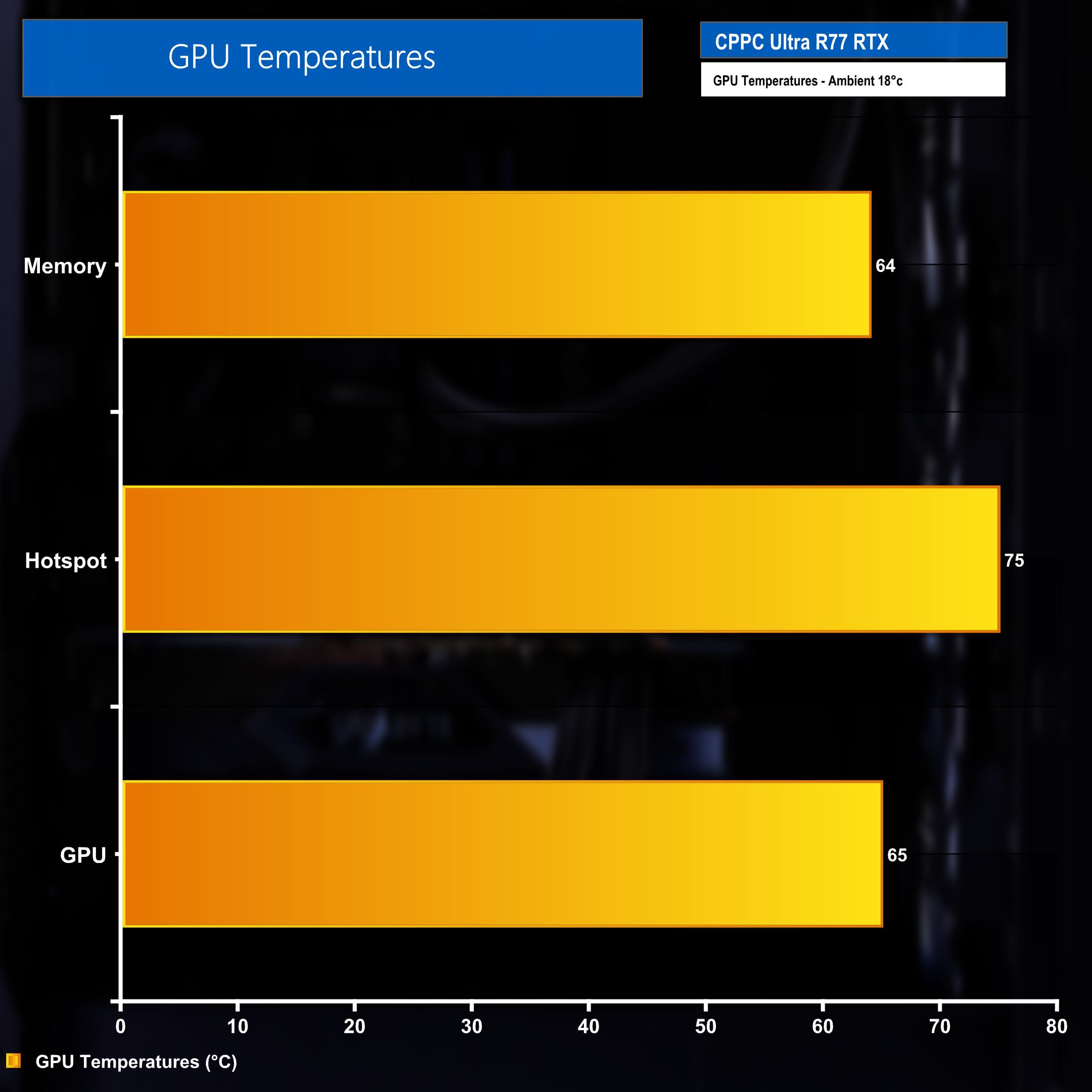 The MSI Gaming X Slim variant of the Nvidia Geforce RTX 4080 Super handled thermal load relatively well during our sustained test in Cyberpunk 2077, reaching a 75 degrees celsius hotspot reading and a 65 degree GPU temperature.