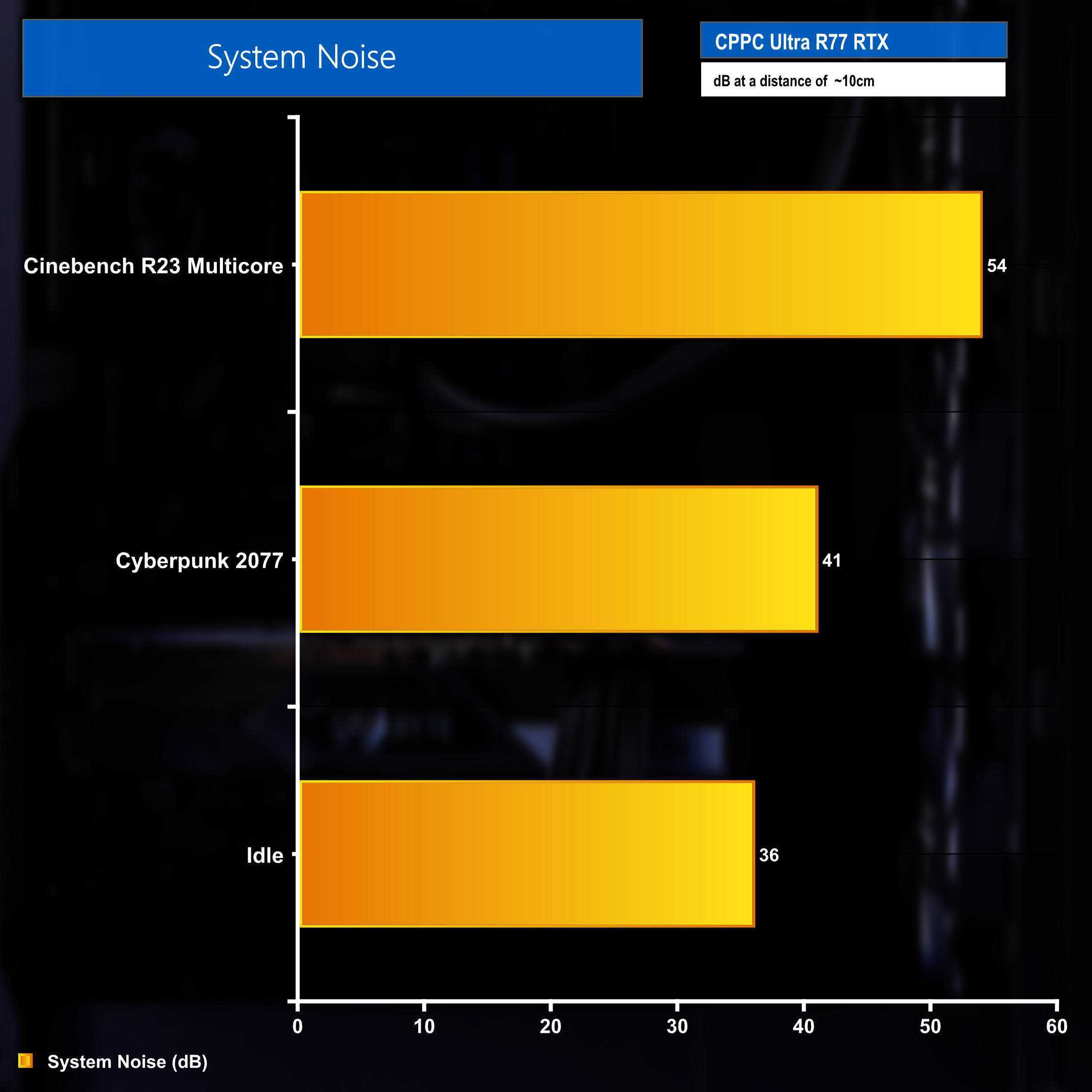 The system does generate a significant amount of noise when carrying out CPU intensive tasks – as can be seen from the 54 decibels recorded during a Cinebench multicore run. However, during gaming and when idle, the system noise is nothing out of the ordinary.