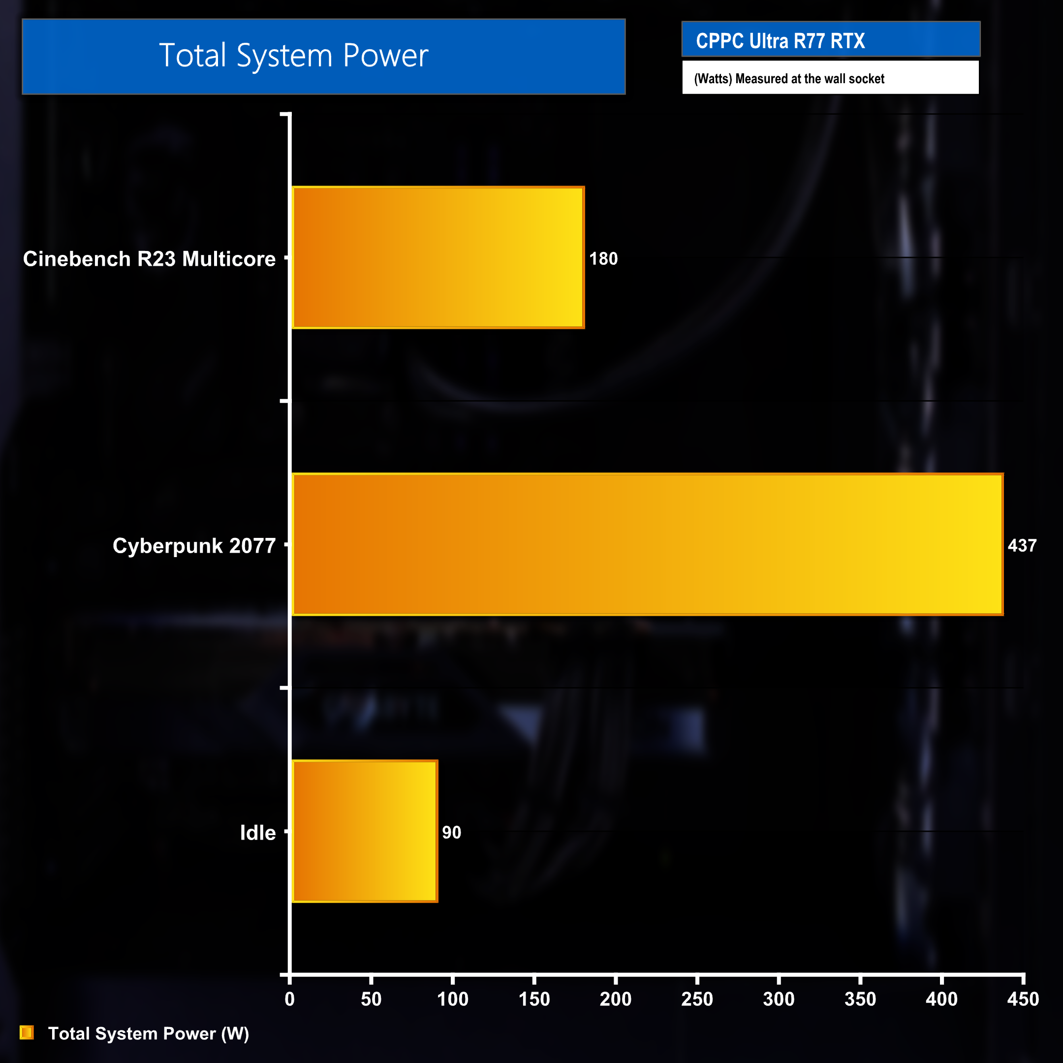 Total system power when measured from the wall socket peaked at 437 watts when running Cyberpunk 2077 on maximum settings. The GPU pushes this figure up substantially higher than the 180 watts recorded during a Cinebench multicore run and 90 watts with the system sitting idle.
