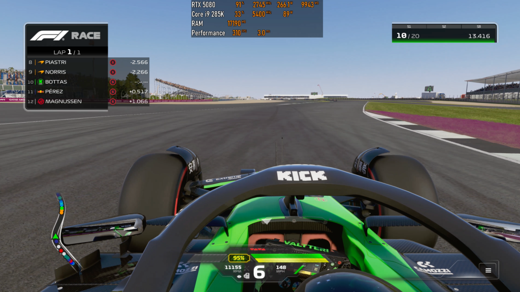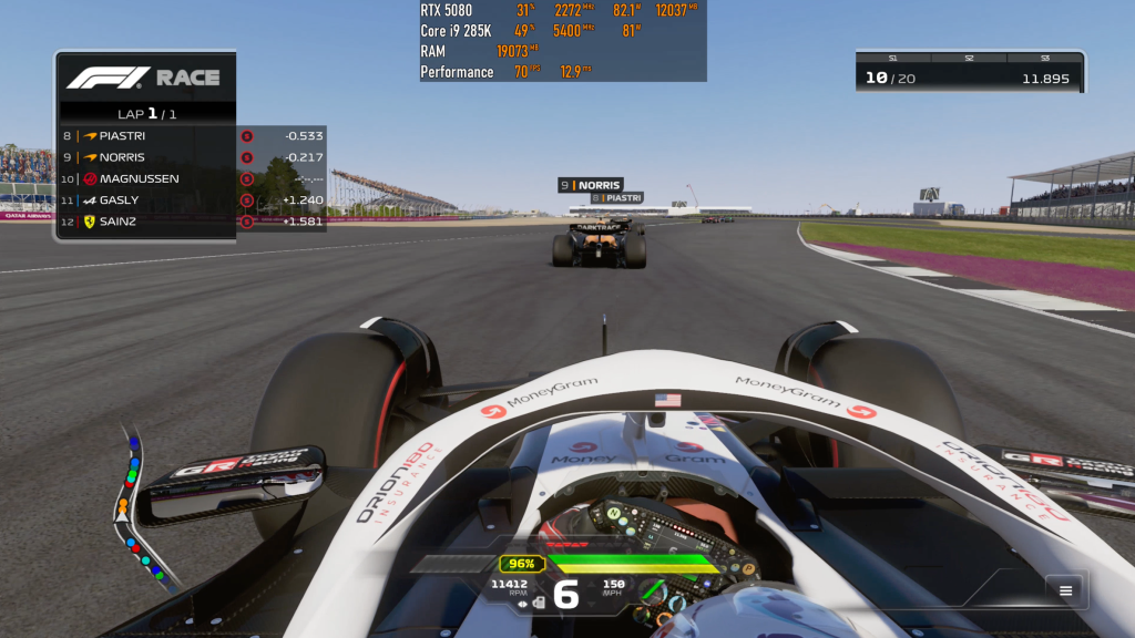 You can see the impact on performance in the below screenshots from F1 24, running at 1440P maximum settings. The increased GPU utilisation when the graphics card is correctly slotted leads to massively increased performance.
