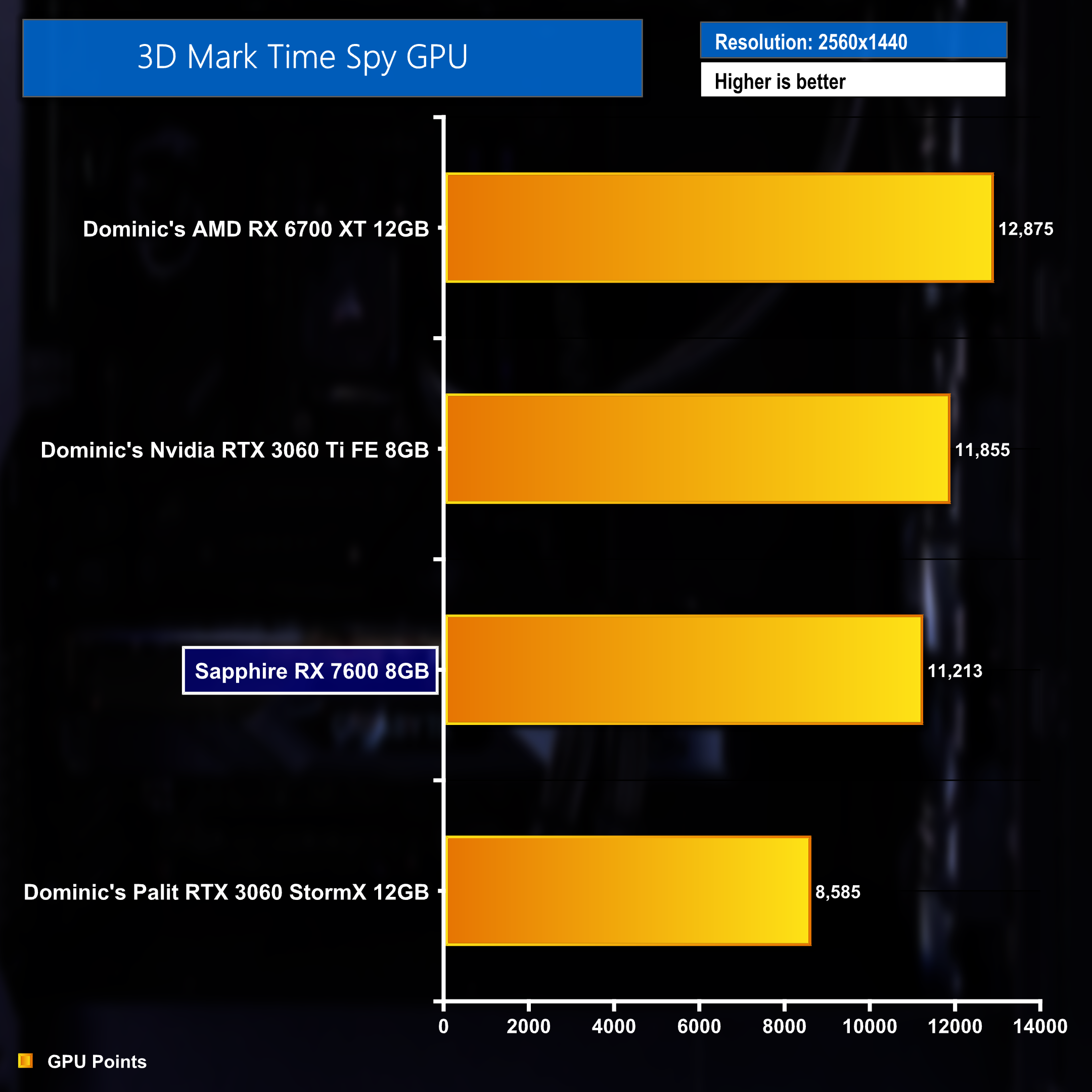The Sapphire Pulse Radeon RX 7600 found in the PCSpecialist Fusion recorded a score of 11,213 points in our 3D Mark Time Spy GPU benchmark. This puts it just behind the Founders Edition Nvidia RTX 3060 Ti tested by Dominic recently.