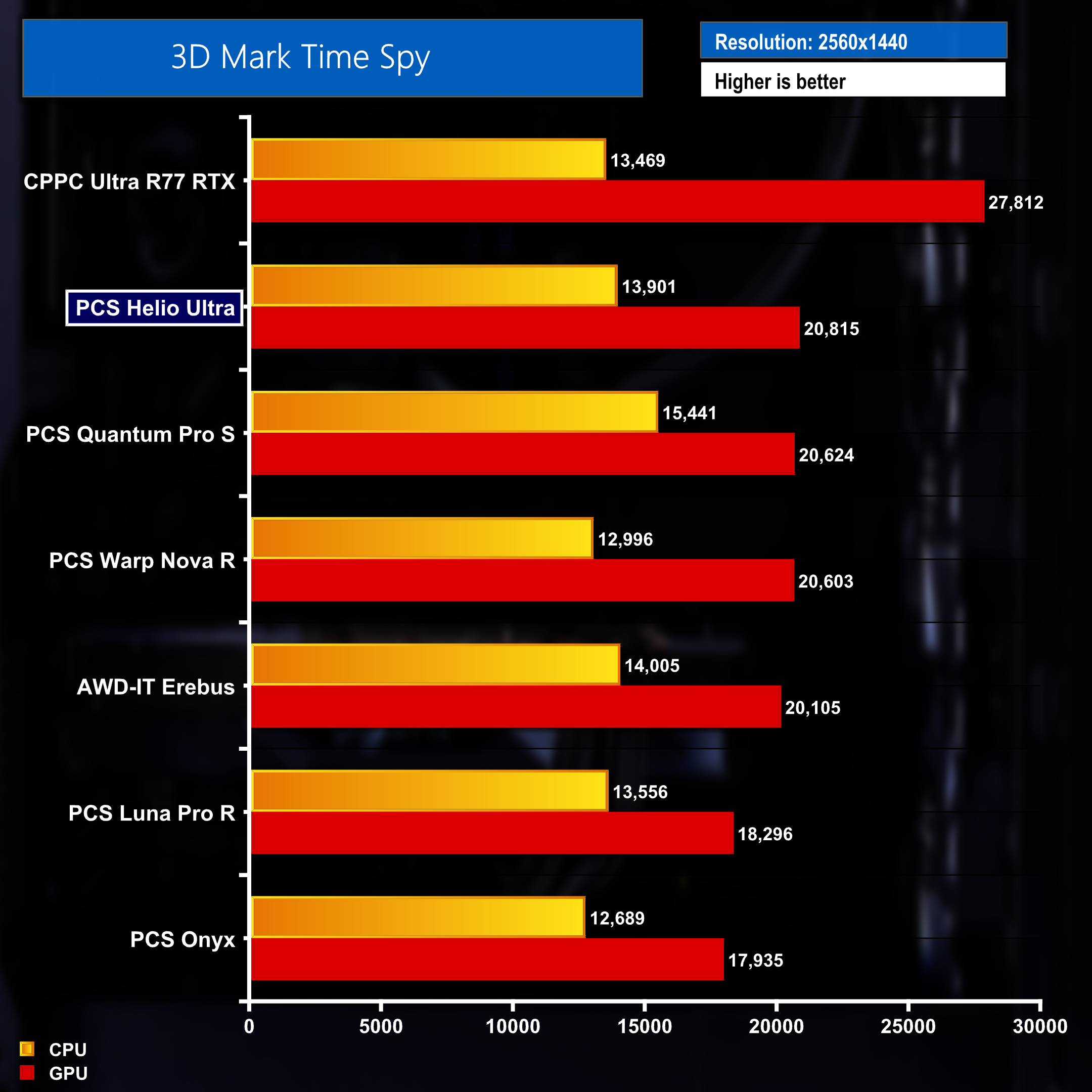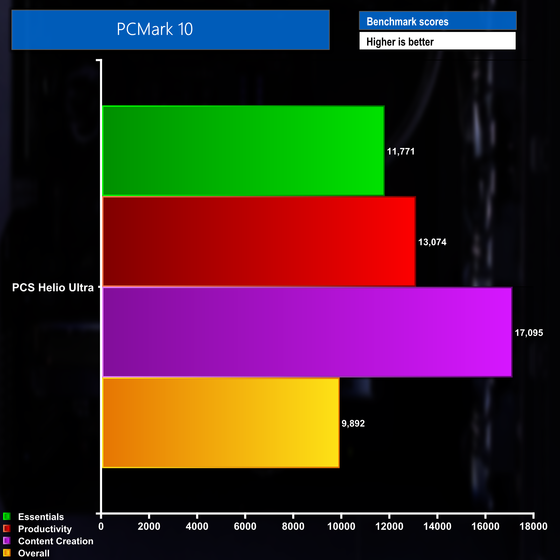 Finally, PC Mark 10 highlights the systems overall capabilities. The content creation category is the clear leader thanks to the dedicated graphics card and ‘gaming' design of the system.