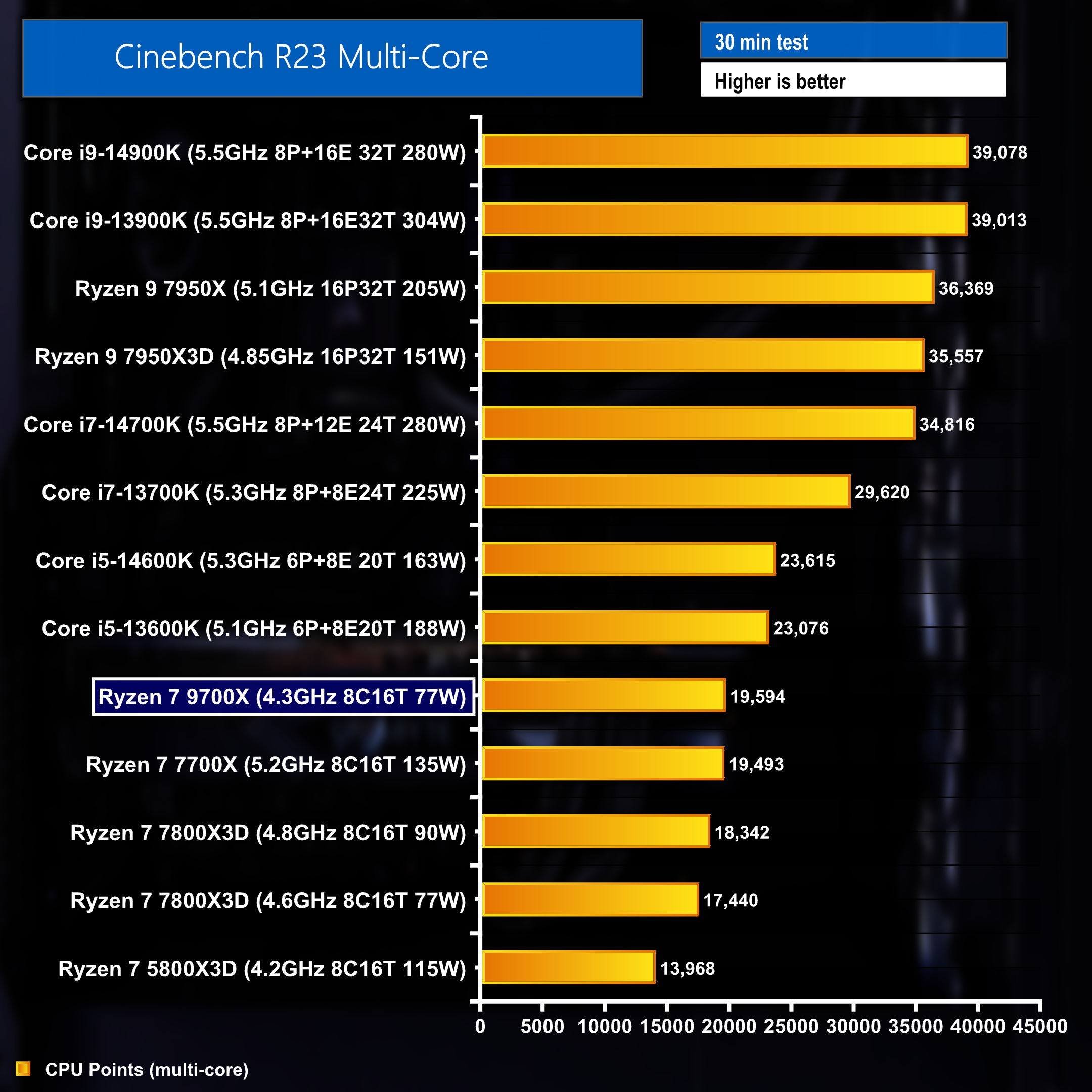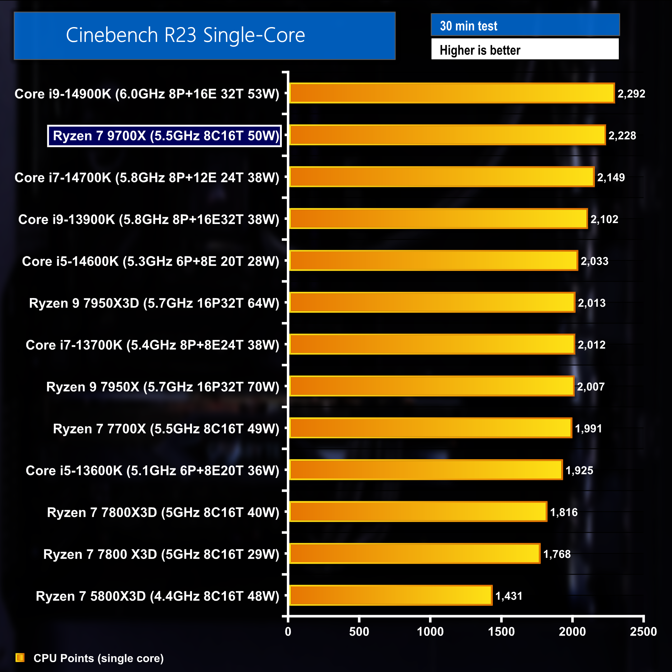 Results improve drastically when moving into single core performance, with the Ryzen 7 9700X recording a very impressive 2228 points, putting it firmly amongst the results from previously tested 13th and 14th generation Intel processors.