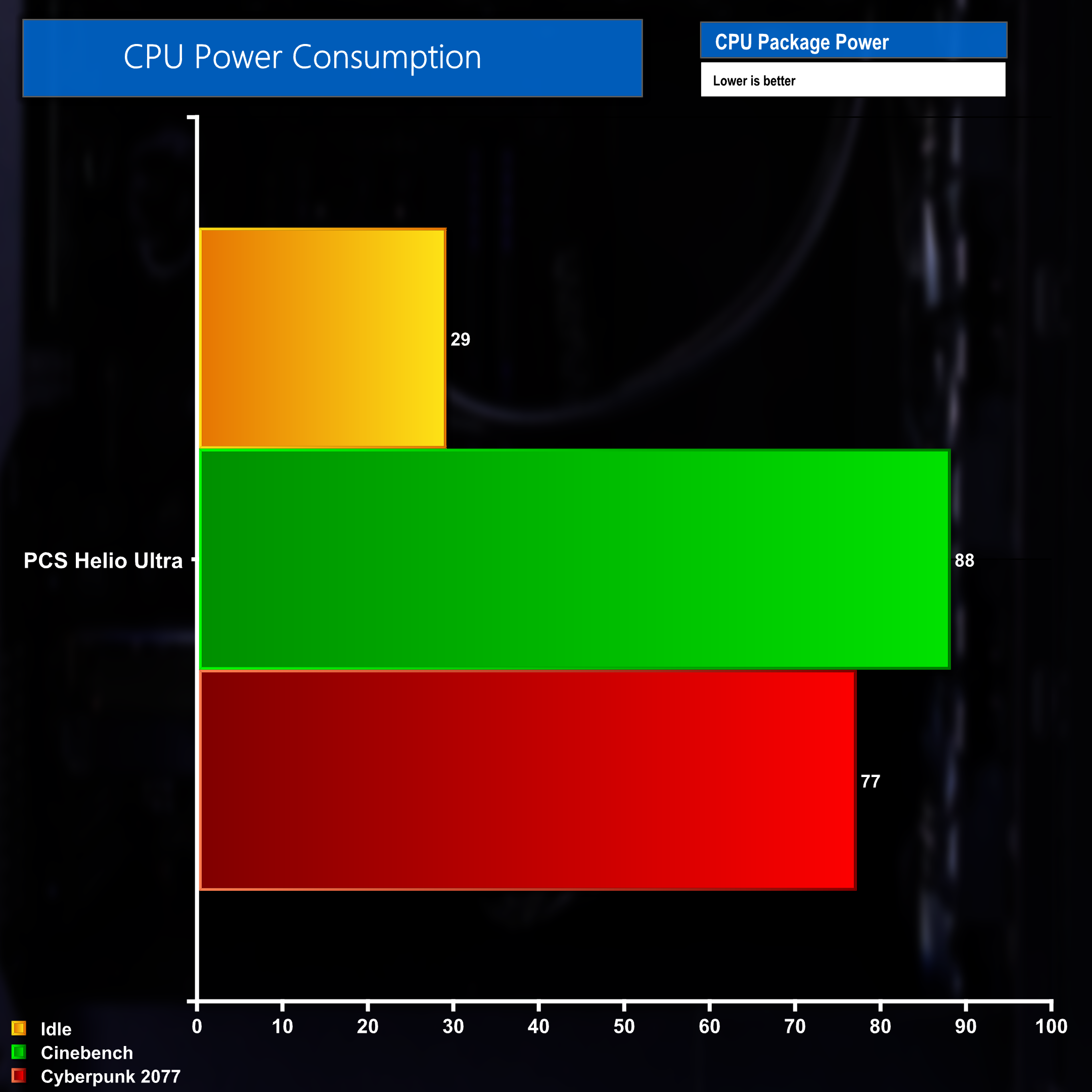 CPU package power consumption highlights the efficiency of the Ryzen 7 9700X. Using just 29W when idle, 88W during a Cinebench multicore benchmark and 77W when gaming in Cyberpunk 2077.