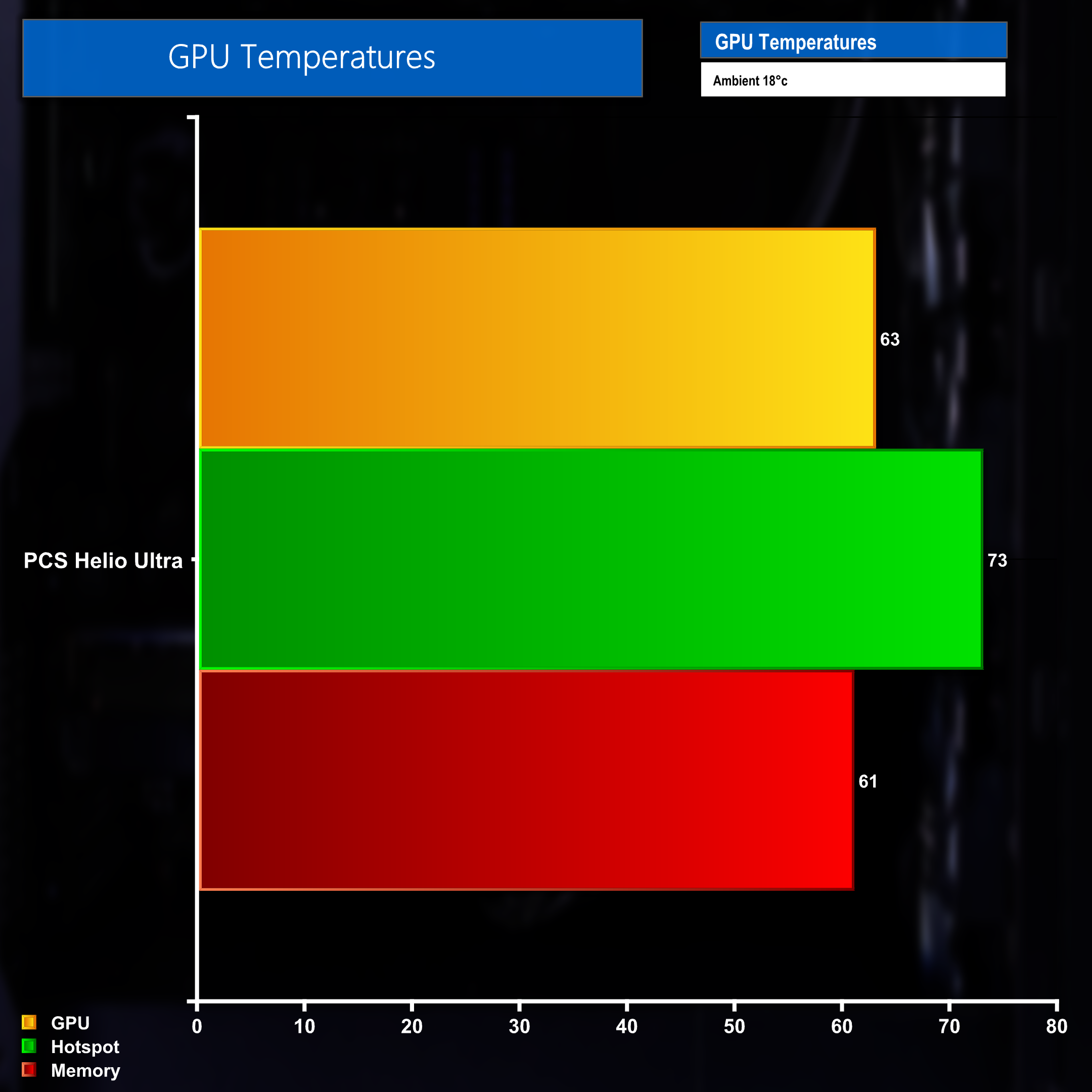 The Gigabyte RTX 4070 Super Aero OC graphics card found in the Helio Ultra ran quite cool during a prolonged gaming stress test in Cyberpunk 2077. The GPU sensor peaked at 63 degrees, while the hotspot and memory sensors reached 73 and 61 degrees respectively.