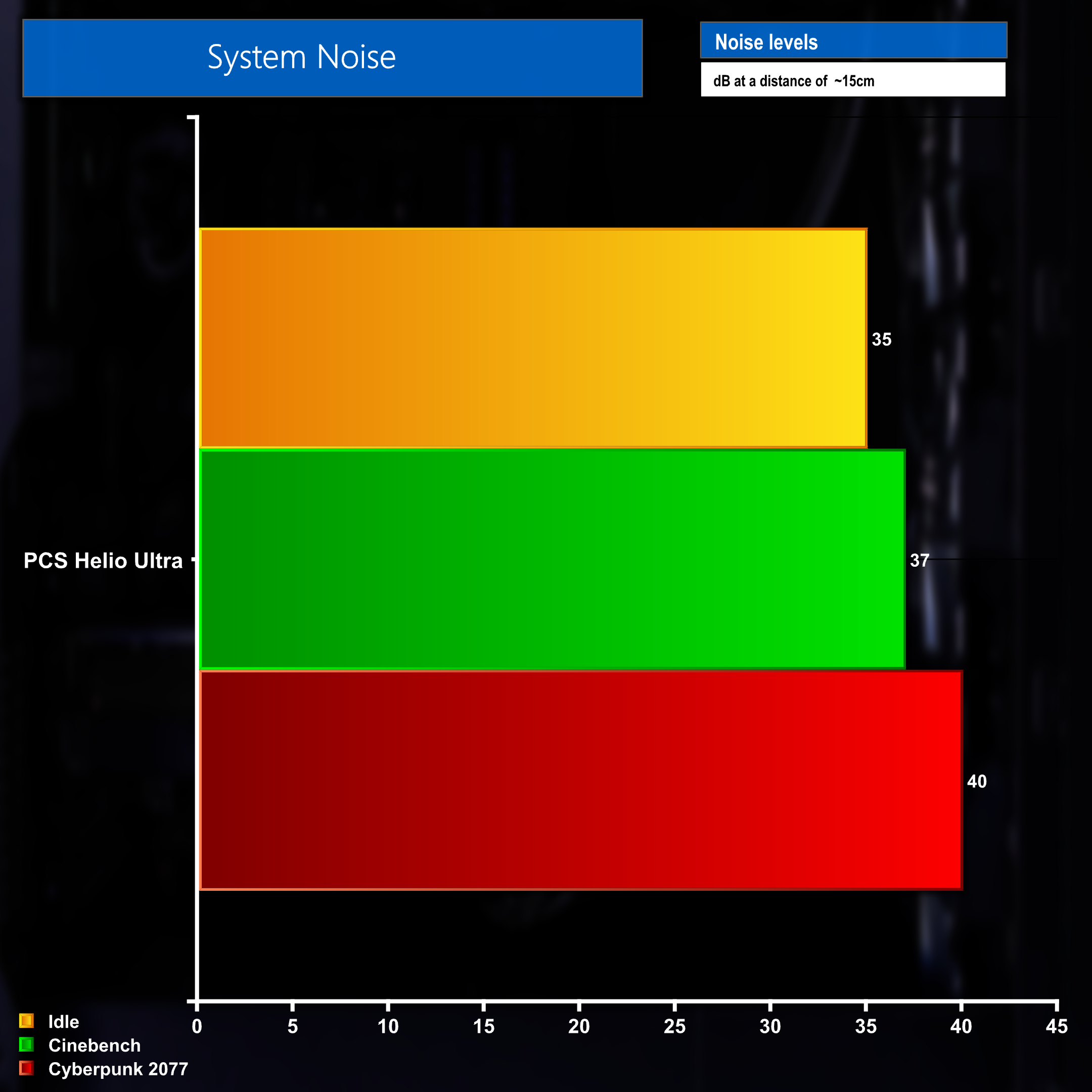 The Helio Ultra contains a total of 7 120mm fans (including 3 found on the the CPU coolers radiator) which leads to a peak of 40dB of system noise when gaming. This is when measured from roughly 15cm away from the case with a noise floor of roughly 30dB.
