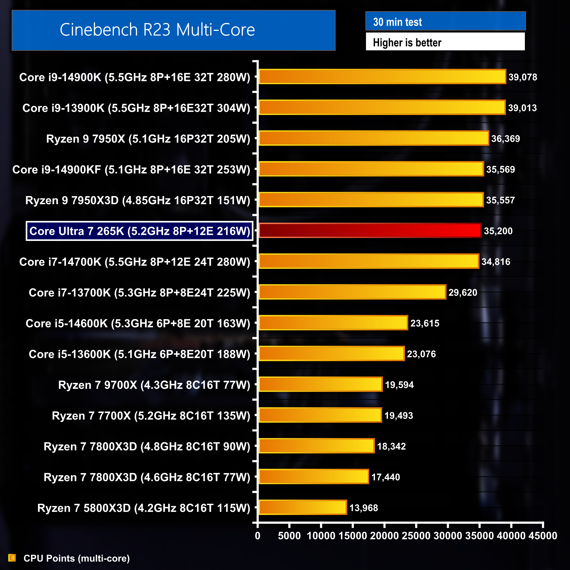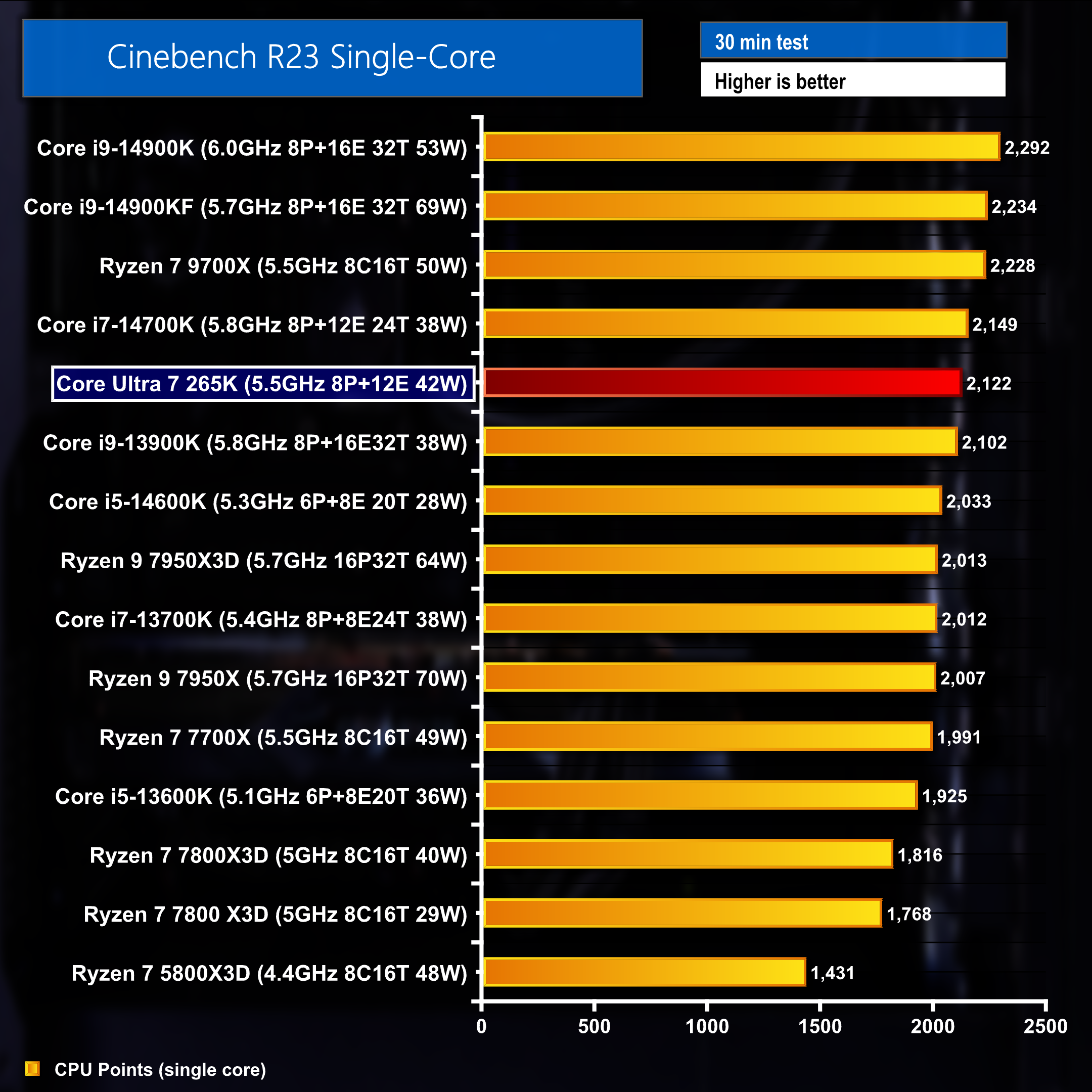 The same 3 run average score from a 30 minute singlecore Cinebench R23 benchmark resulted in a score of 2122 points – landing the 265K in 5th place overall – sitting just underneath the 14700K and just above the last-gen 13900K.