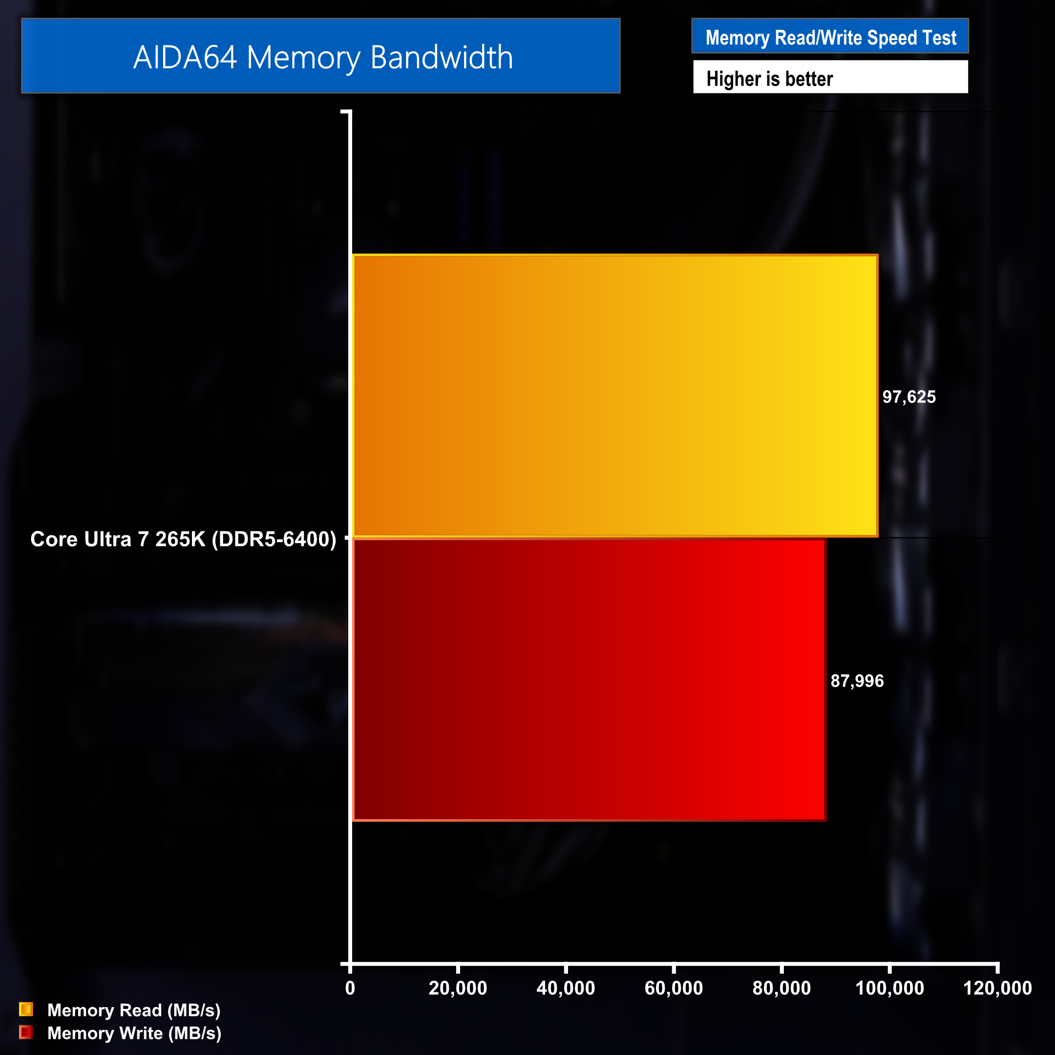 Measuring memory speed and performance with AIDA64 resulted in read speeds of 97,625MB/s and write speeds of 87,996MB/s from the Corsair Dominator Titanium memory.
