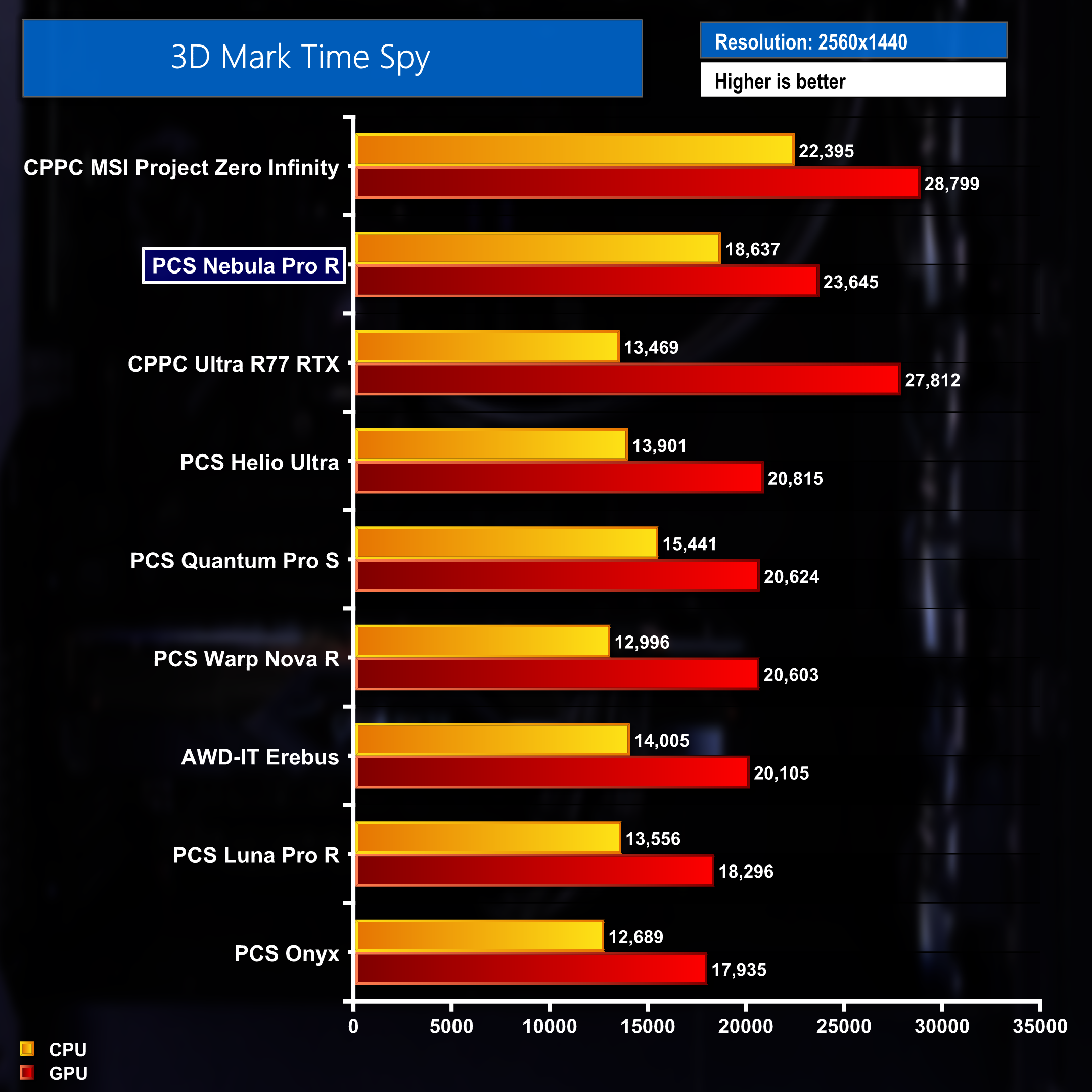 Looking at performance when measured with 3D Mark Time Spy then, which at first glance looks like a convincing result for the Nebula Pro R. It finished second overall when ordering the chart by the CPU score. Recording a result of 18,637 points