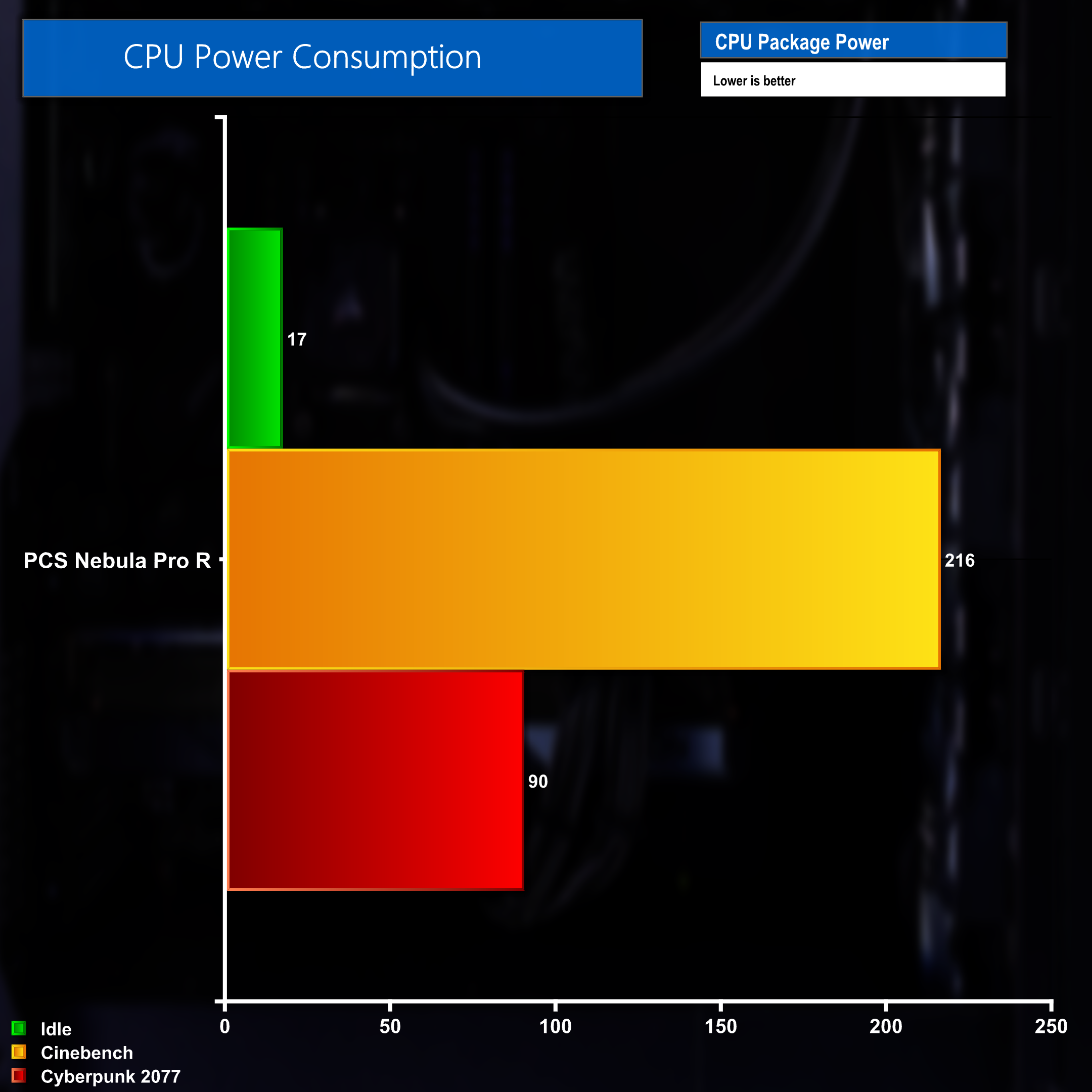 That power use dropped to 90w when gaming in Cyberpunk 2077 and fell even further to just 17w when idle.
