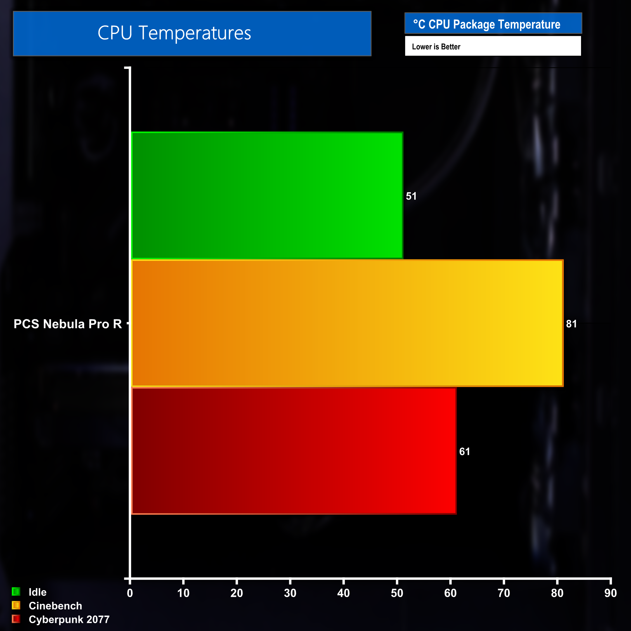 Those power usage figures in the previous chart, when combined with the cooling capabilities of the system, results in CPU package temperatures of 81 degrees in Cinebench, 61 degrees when gaming and 51 degrees when idle.