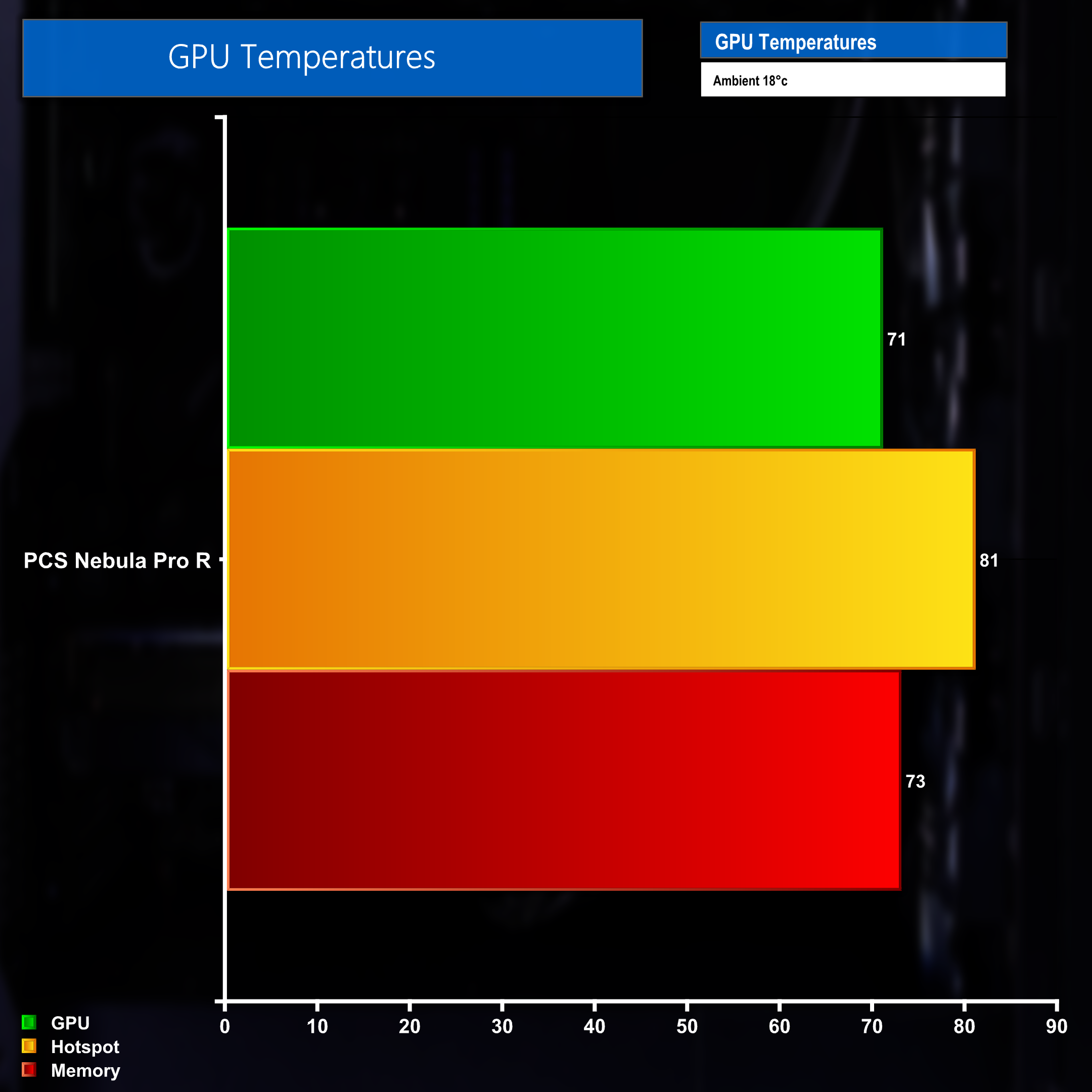 Taking a closer look at GPU temperatures while gaming shows a peak hotspot temperature of 81 degrees, while the overall GPU sensor at 71 degrees was a nice even 10 degrees cooler and the memory was a touch higher than that at 73 degrees.