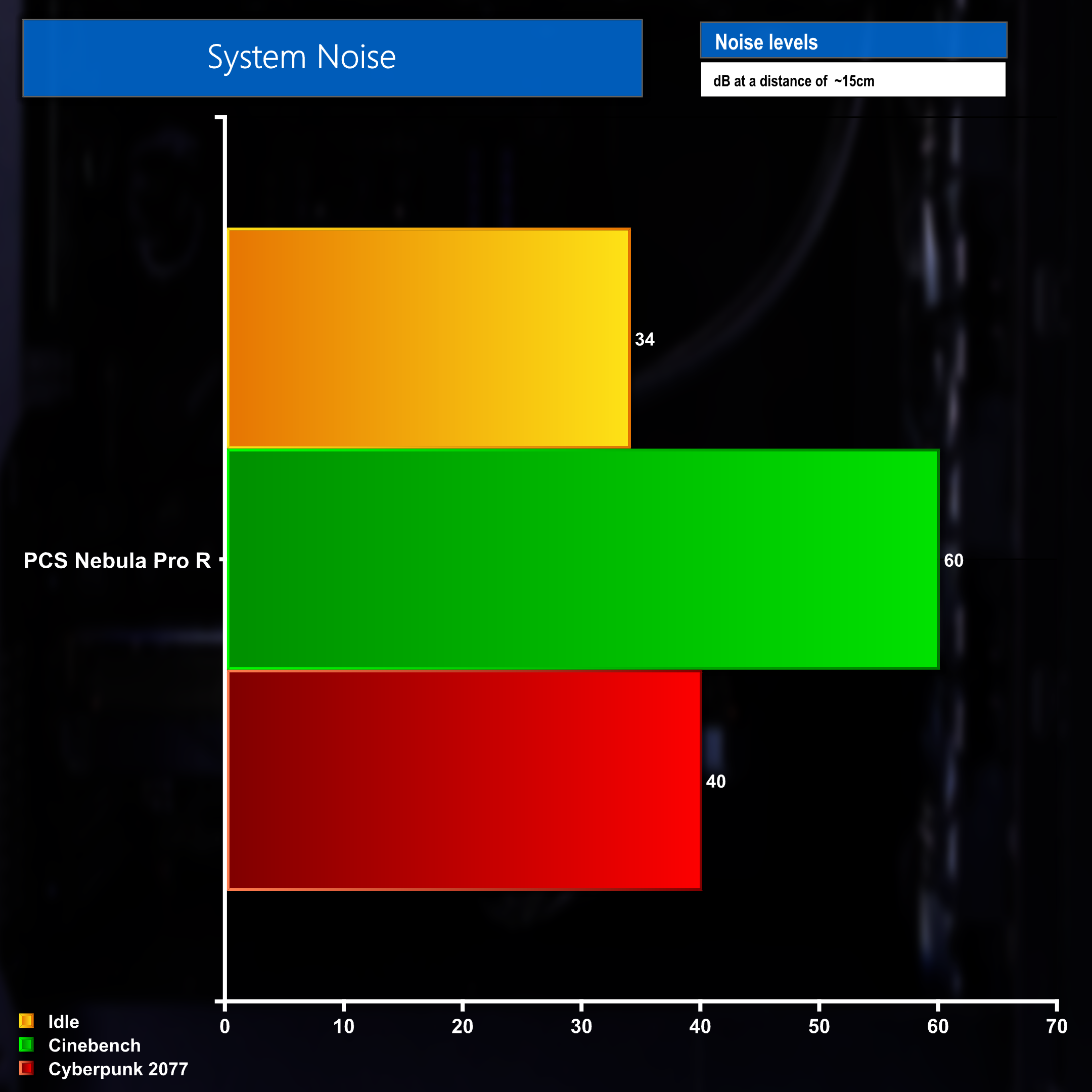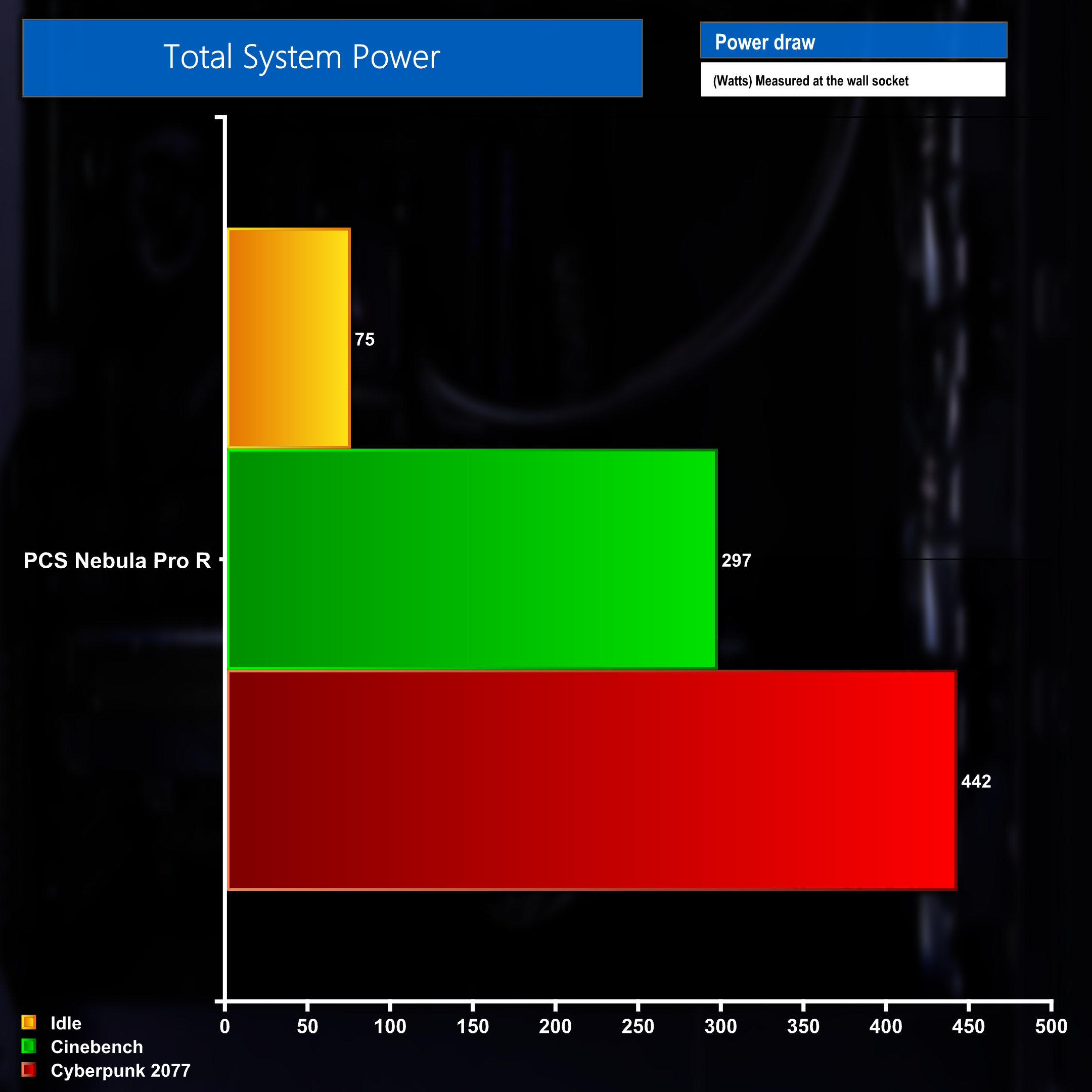 The final chart to look at is total system power usage when measured at the wall socket – the Nebula Pro R consumed 75 watts when idle, 297 watts when running a CPU heavy task such a Cinebench and 442 watts when engaging both the CPU and GPU when gaming.