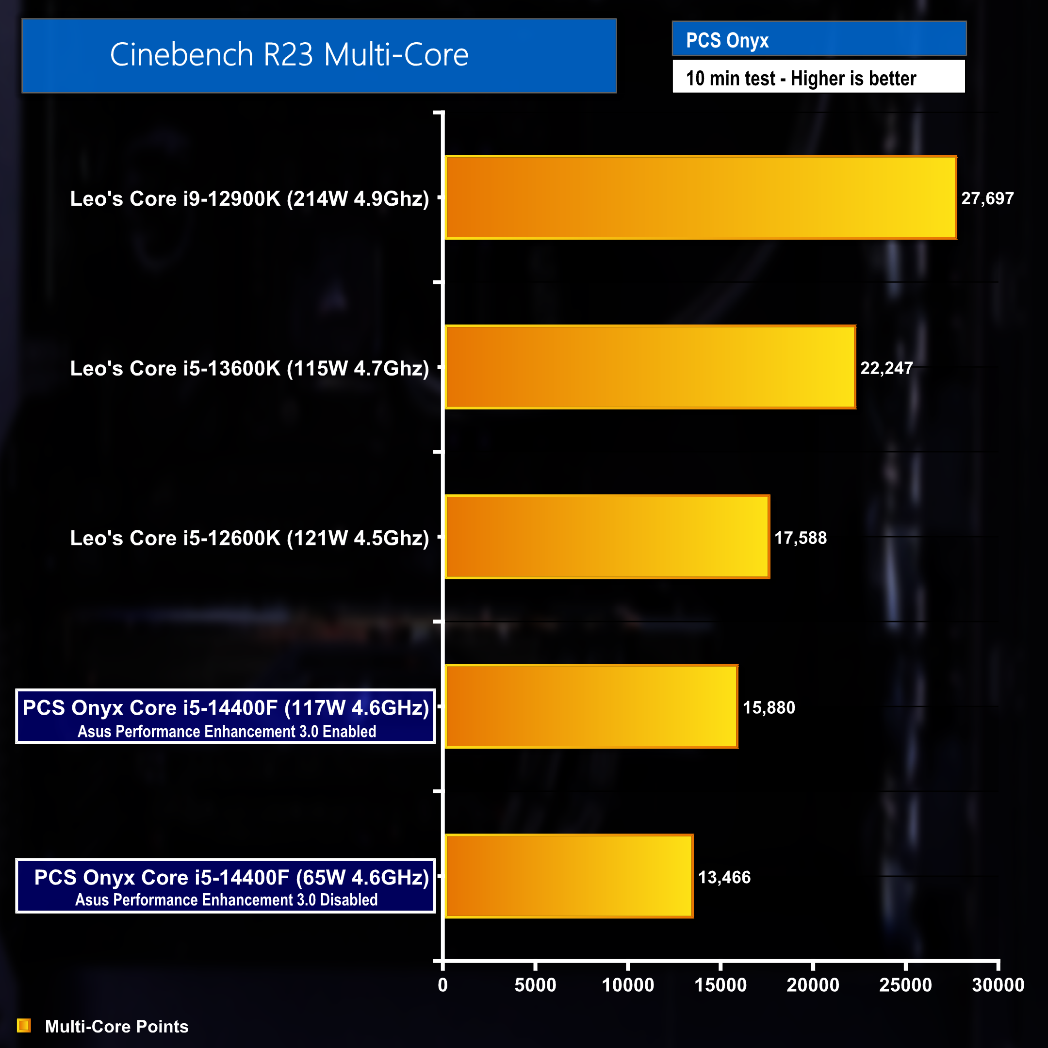Out of the box, the ASUS Performance Enhancement 3.0 setting is disabled in BIOS. This applies default stock Intel power limits of 65W PL1 and 145W PL2.