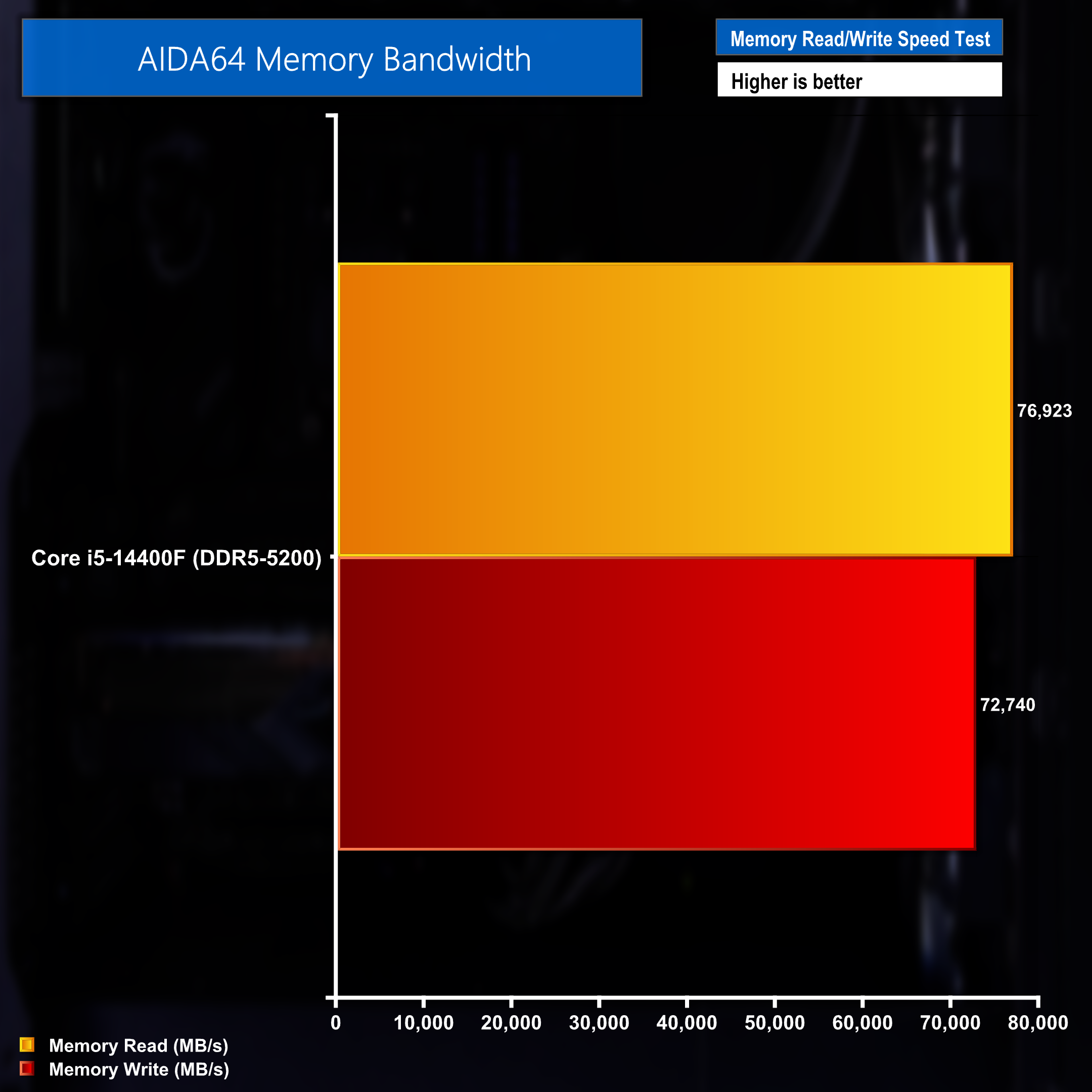The DDR5 memory in the Onyx desktop performed quite well during our AIDA64 benchmark. Read speeds were 76923MB/s and write speeds came in at 72740MB/s.
