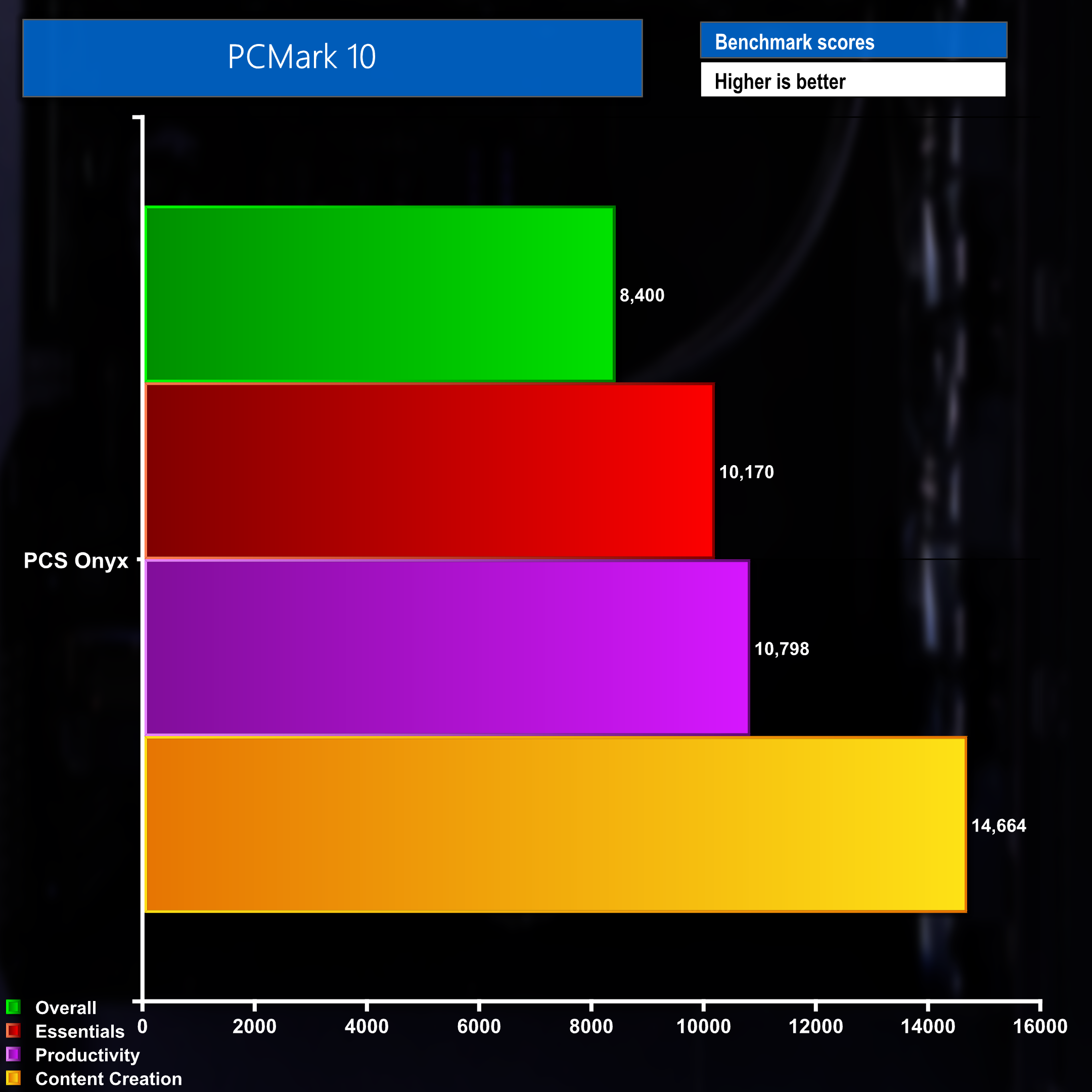 Finally, in PC Mark 10 the Onyx shows a clear strong point in the content creation category – thanks no doubt in part to the RTX 4070 graphics hardware.