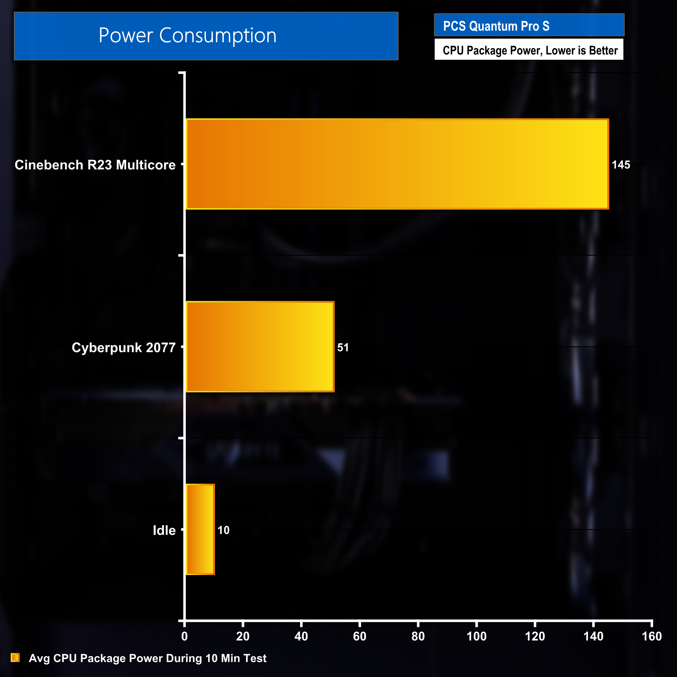 Turning this setting off allows the CPU to use much more power due to increasing PL1 and PL2 power limits to 253W. This is reflected in the much higher 145W CPU package power consumption in the same 30 minute Cinebench benchmark.