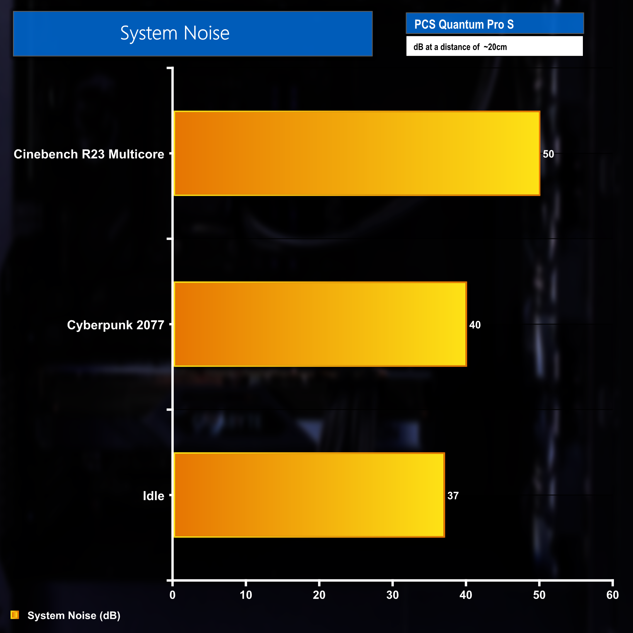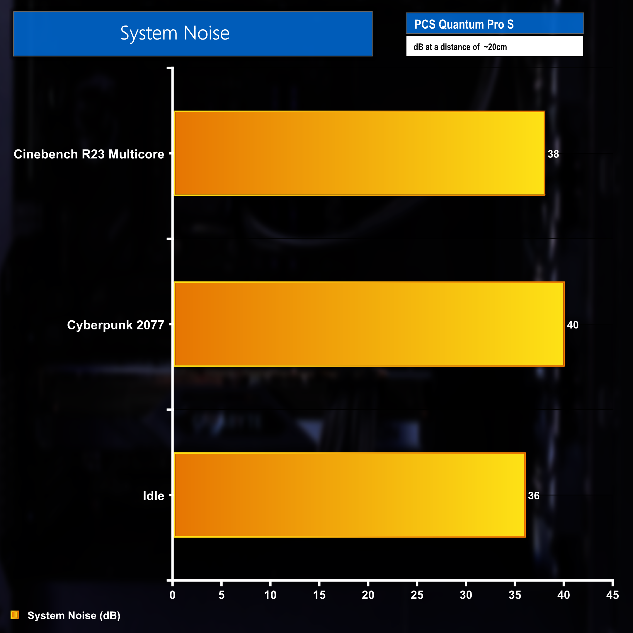 Again, pushing those limits and power usage upwards does result in an substantial increase in noise levels when running a Cinebench benchmark, however, just as we saw with the power usage and temperatures, system noise remains mostly the same whilst gaming and at idle.