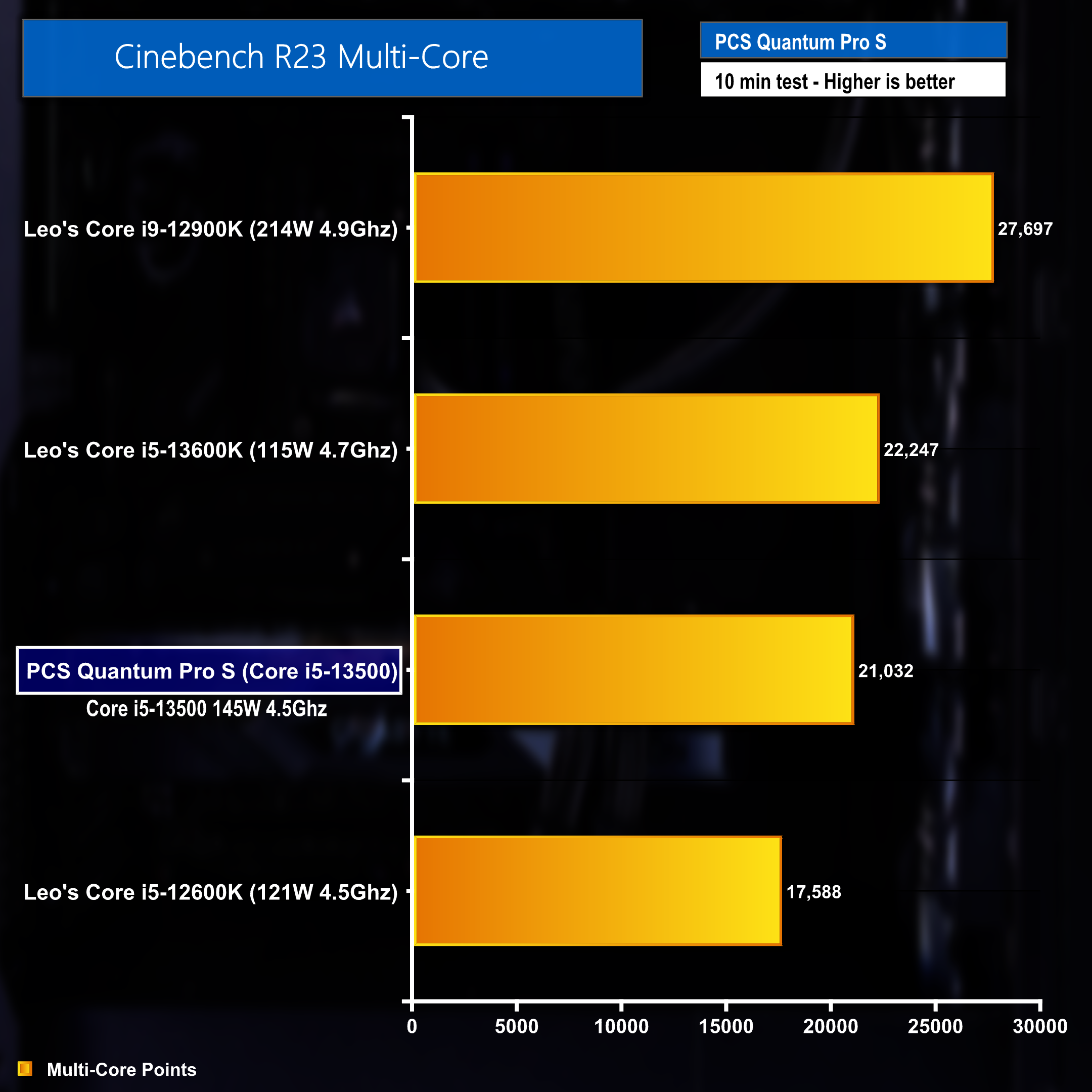 Coming back to talk about the difference in performance when enabling ASUS Performance Enhancement 3.0 – The graph above shows a Cinebench benchmark result with the setting DISABLED, which returned a disappointing result of 14,729 points. Placing the Core 15-13500 beneath the 3 comparison processors.