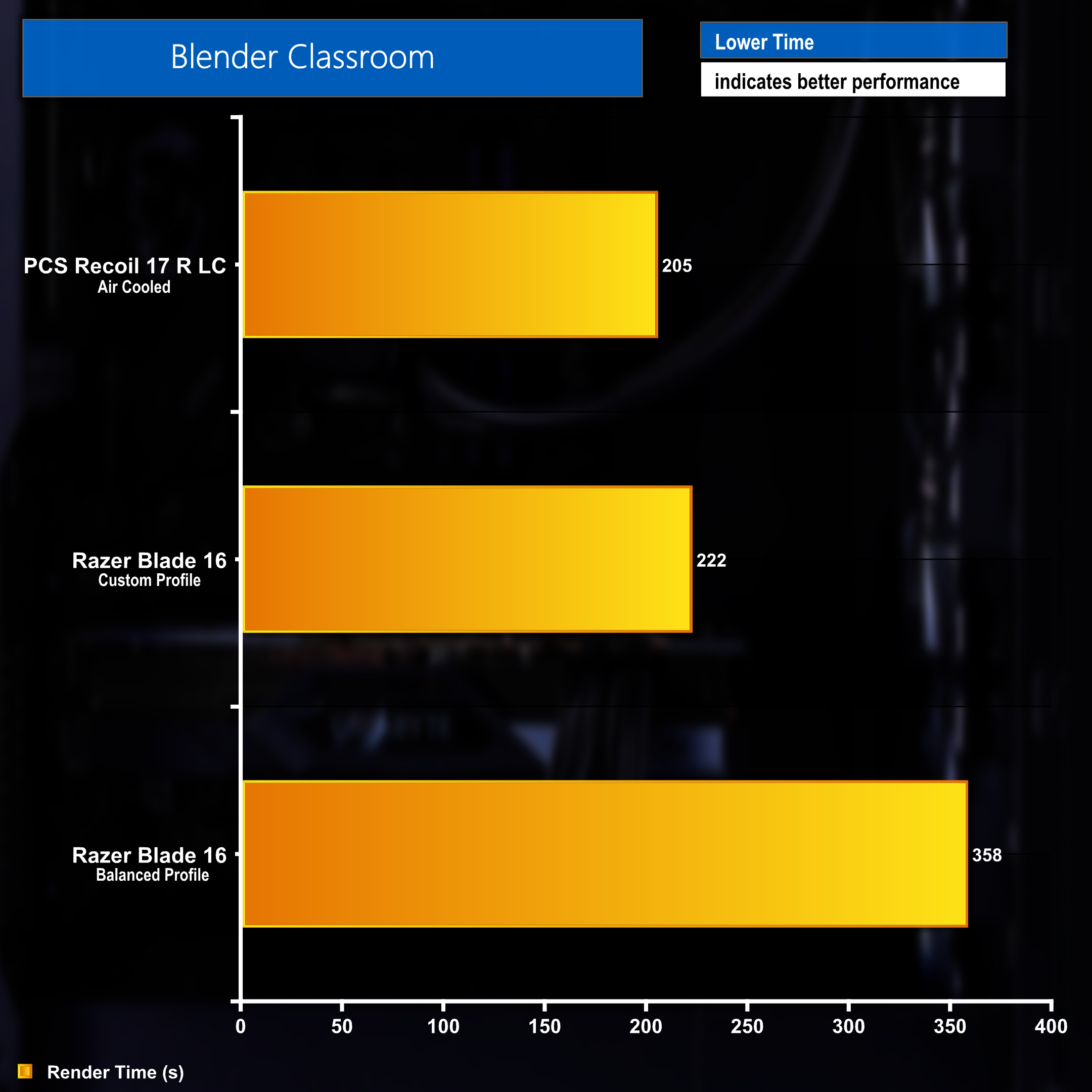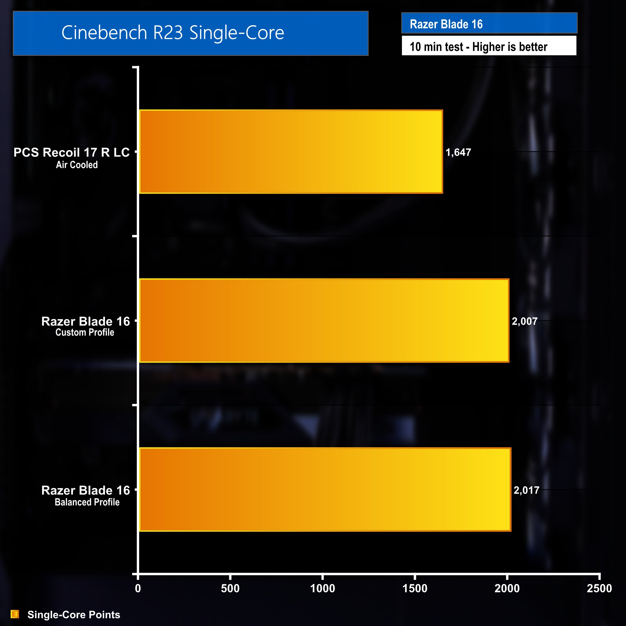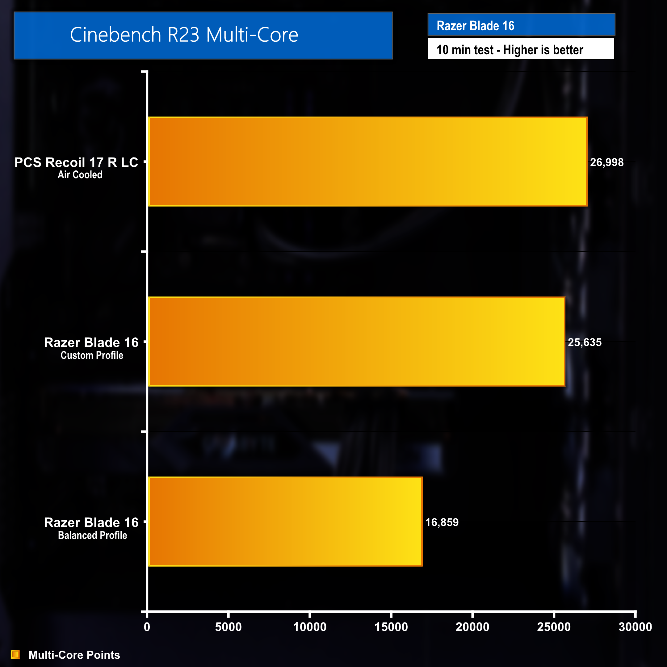 Synthetic benchmark results were similar to the recently reviewed Recoil 17 R LC from PCSpecialist. The Intel CPU found in the Razer Blade 16 provides better single core performance and falls behind in multi threaded workloads irrespective of the Core i9-1950HX being a technically superior CPU to the chip found in the comparison system. The overall performance of the Razer Blade 16was held back quite significantly by some quite serious thermal throttling occurring during CPU intensive workloads in both the custom and balanced profiles. With the custom profile active, up to 6 of the 8 performance cores dipped to 798MHz during testing.