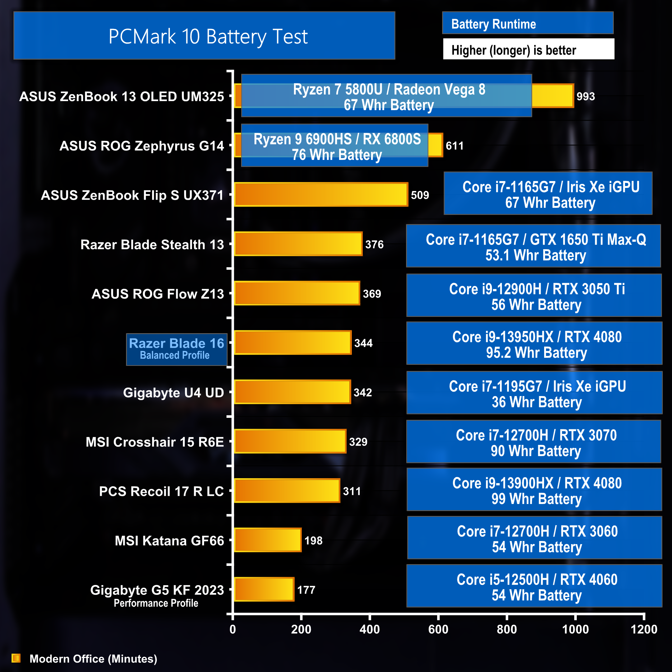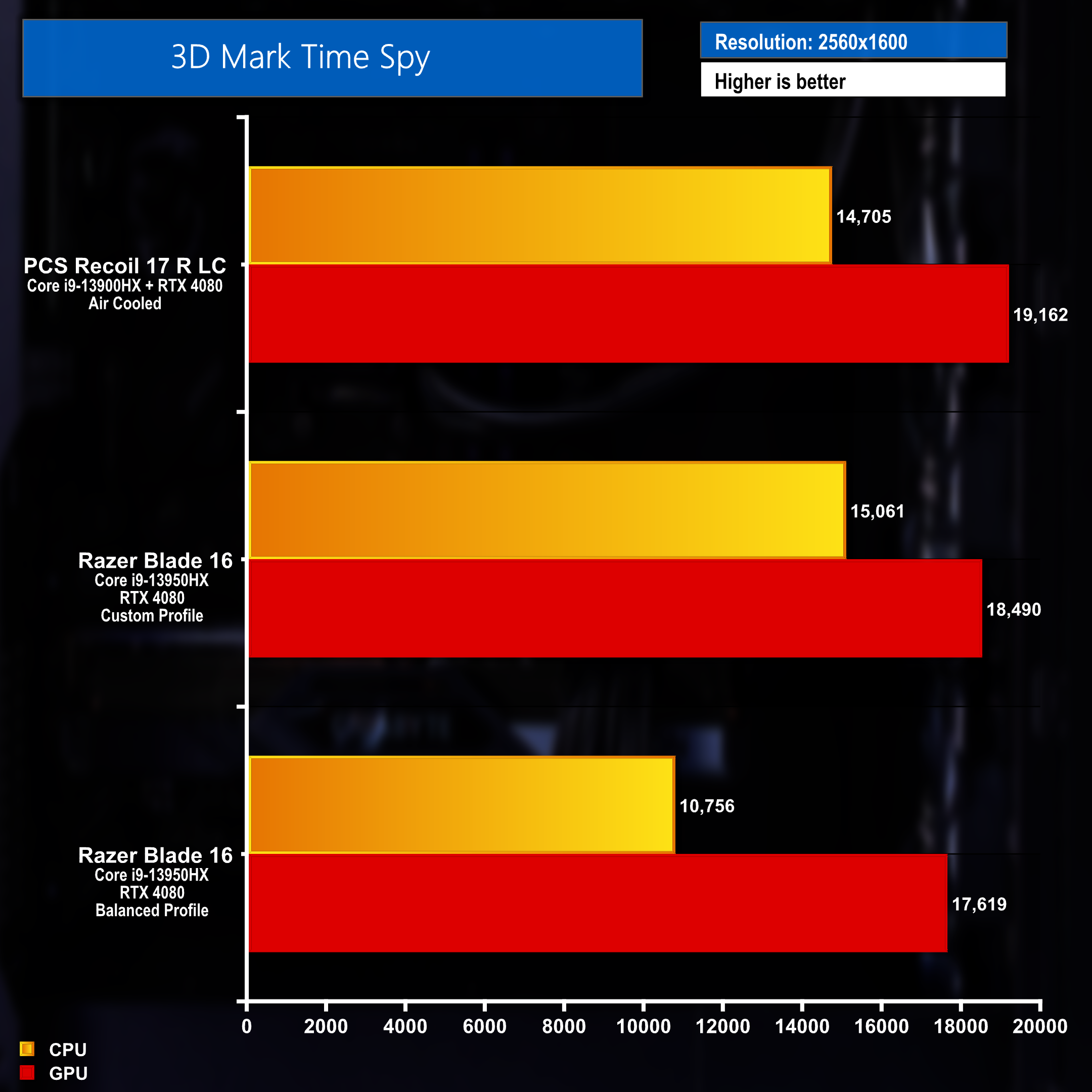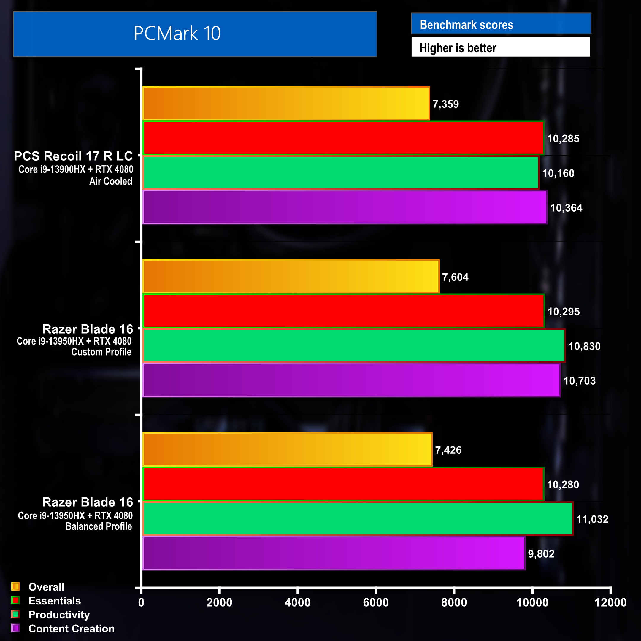 Synthetic benchmark results were similar to the recently reviewed Recoil 17 R LC from PCSpecialist. The Intel CPU found in the Razer Blade 16 provides better single core performance and falls behind in multi threaded workloads irrespective of the Core i9-1950HX being a technically superior CPU to the chip found in the comparison system. The overall performance of the Razer Blade 16was held back quite significantly by some quite serious thermal throttling occurring during CPU intensive workloads in both the custom and balanced profiles. With the custom profile active, up to 6 of the 8 performance cores dipped to 798MHz during testing.