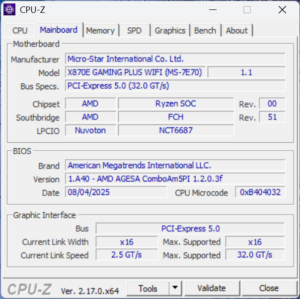 - Motherboard: MSI AM5 X870E GAMING PLUS WIFI