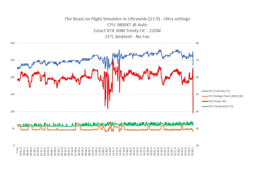 So what results should you expect from a gaming system built with The Beast? The video above showcases a build using an AMD Ryzen 3800X and an Nvidia GeForce RTX 3080 with no fans at all running Microsoft Flight Simulator (2020) at 3440×1440, which as we learned last year, is one of the most demanding modern games available on PC at the moment.