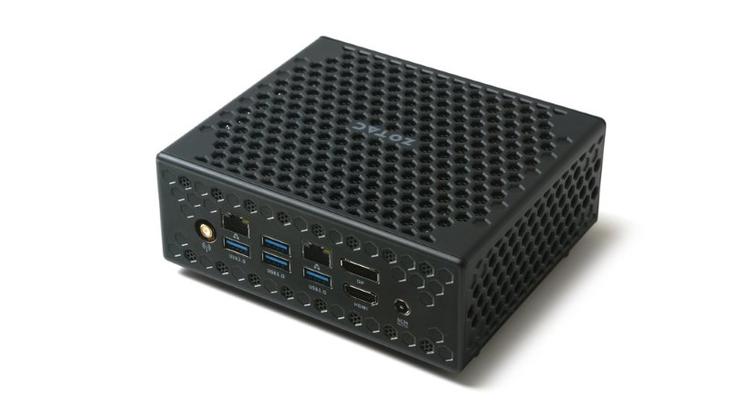 If you're wondering just how small the ZBox Nano is, then here are the exact dimensions: 5.76 (H) x 4.98 (W) x 2.36 inches (D). For IO, the system carries dual ethernet ports, four USB 3.0 ports, DisplayPort and HDMI.