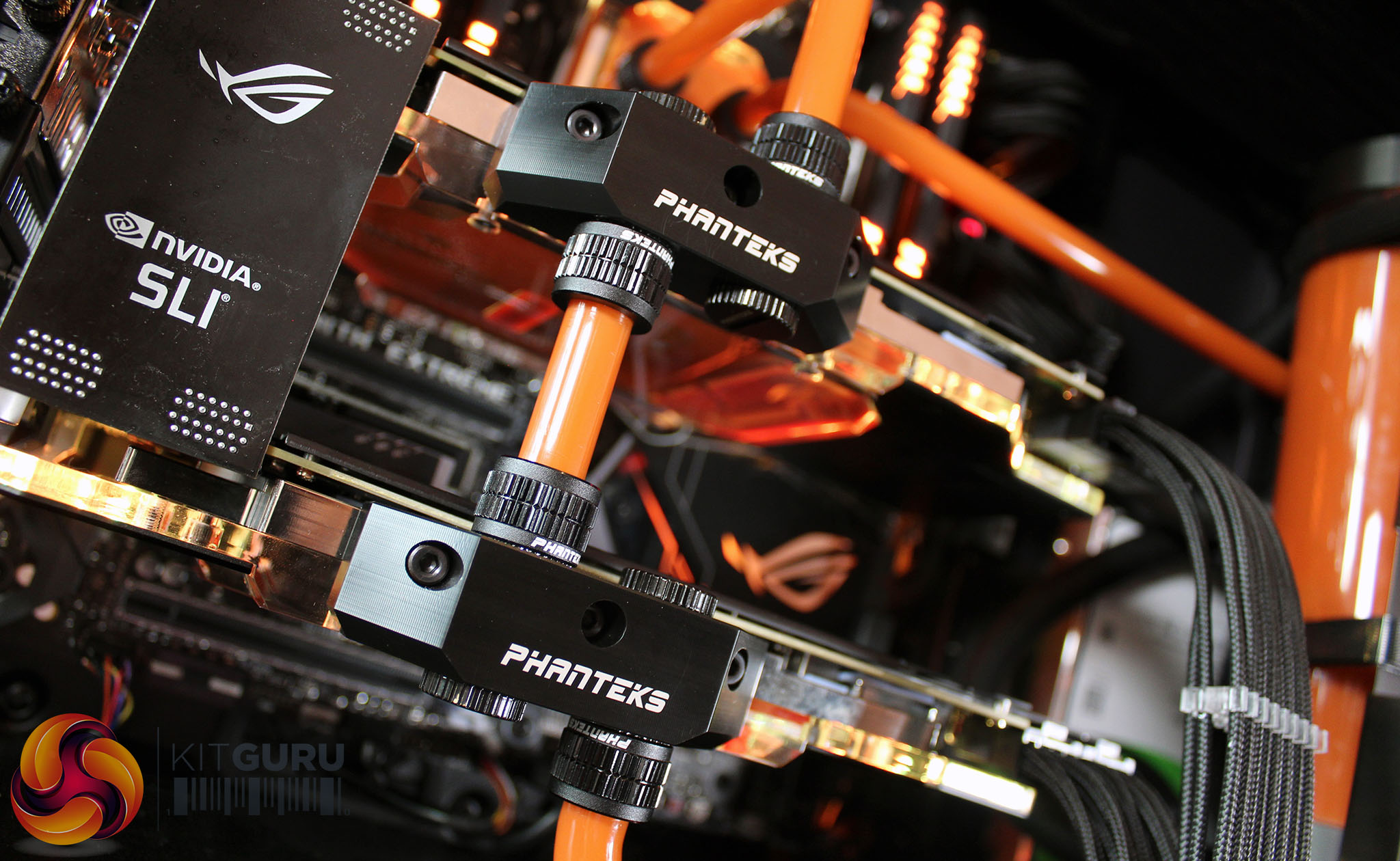 That means your eyes are drawn to the headline hardware. The CPU is topped with a Phanteks Glacier waterblock that uses clear Perspex, and two Phanteks blocks are also used for the GPUs. Solid acrylic tubing flows between all of the components, and Chillblast has used orange Mayhems coolant. The bright liquid can be seen in the tubes and coursing through the waterblocks, and it really stands out against the darker metal found elsewhere on the inside.