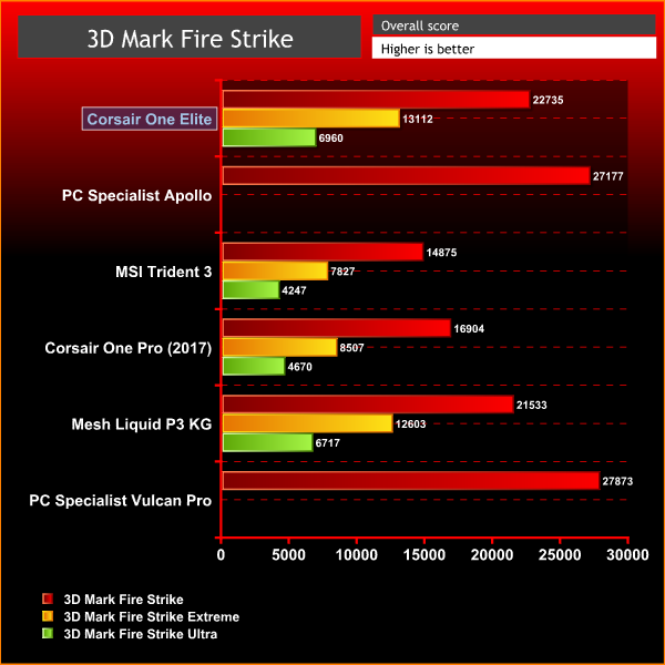 Its Fire Strike result of 22,735 opens up a huge lead over the admittedly cheaper MSI Trident 3 machine, and it also proves quicker than the Mesh Liquid system. In the tougher Extreme and Ultra tests, the Corsair maintained its lead.