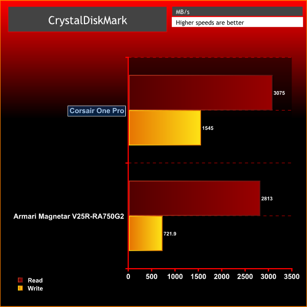 The Corsair One Pro’s Samsung PM961 drive returned read and write scores of 3,075MB/s and 1,545MB/s. They’re both excellent results – the read speed is a little ahead of the OEM drive in the Armari, and the write figure is twice as good.