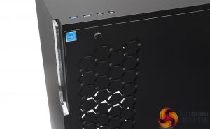The InWin’s no-nonsense design gives way to an interesting interior. The In-Win case flips convention on its head by installing the power supply at the top of the chassis, with the motherboard positioned below.