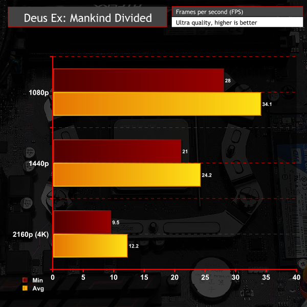 Its 1080p average of 34fps in Deus Ex is fine, for instance – a playable result – but its minimum of 28fps is a little less convincing. That sort of figure means that you’ll likely experience juddering in intense scenes. Thankfully, it’s nothing that a few graphical tweaks won’t fix.