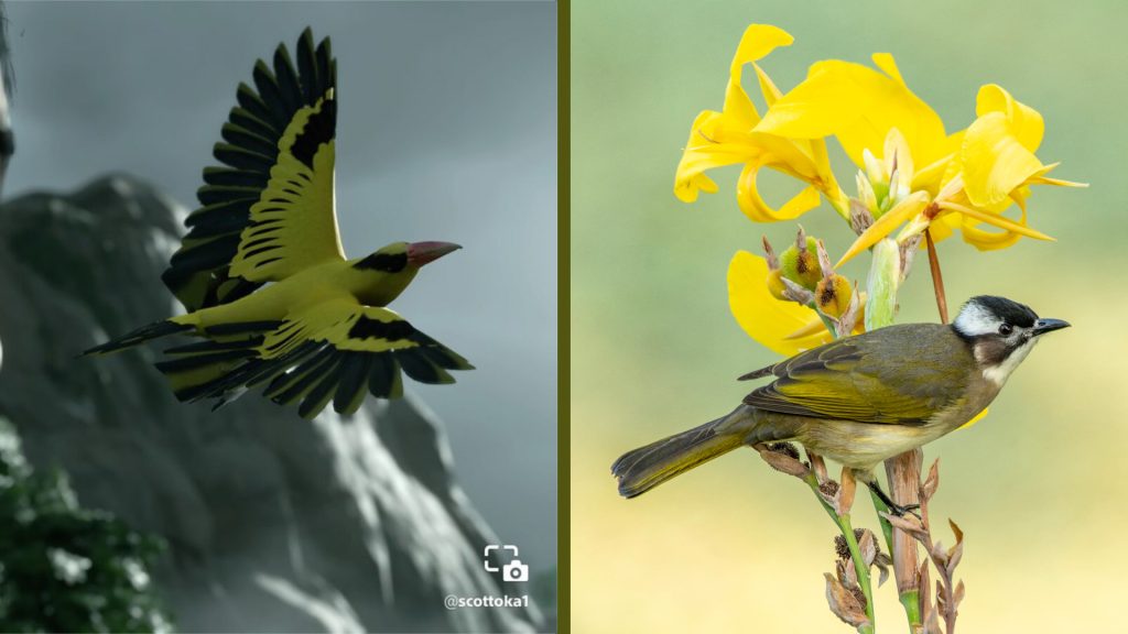 One of the least impactful, though most impressive, attention to lore and word building can be seen with the ‘golden birds’ which fly about and lead you to various points of interest / undiscovered locations. Little information is given about these animals, however in doing some research, the distinct design and colour scheme of these golden birds appear to be heavily based on Tsushima Island’s light-vented bulbul :