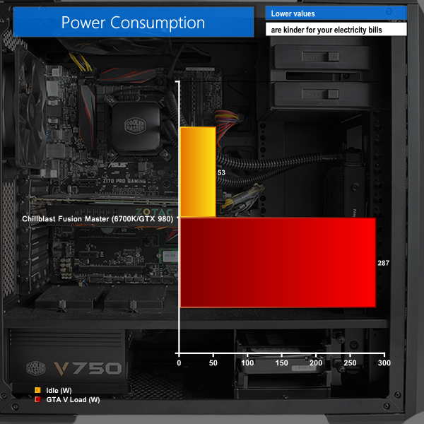 The system demands very little power at idle but will soon require almost 300W once GTA V is running.