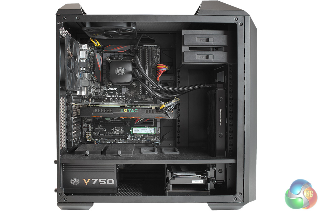 Exhaust fans mounted in the roof and rear of the case expel hot air from inside. The water-cooling block covering the CPU shows the Cooler Master logo clearly, and this illuminates in white when the PC is turned on.
