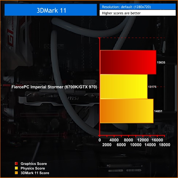 The graphics score in 3DMark11 stresses the GPU more than any other component. With an overclocked Core i7 6700K pushing polygons to the GPU, the GeForce GTX 970 performs slightly better than in a system with a slower CPU.