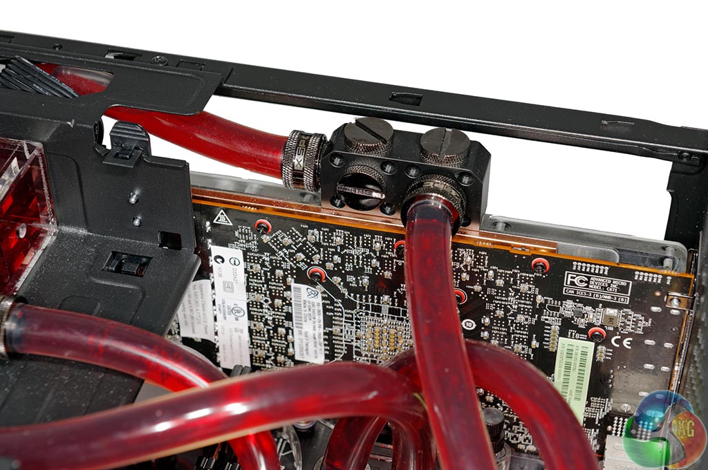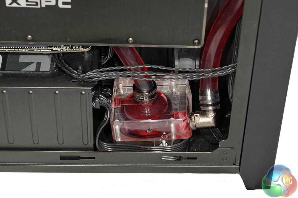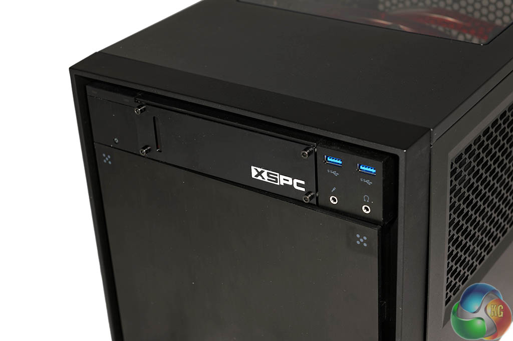The custom XSPC reservoir is installed at the front of the case in the optical drive bay, shown above. Several USB 3.0 ports are located at the side, along with a microphone and headphone jack.