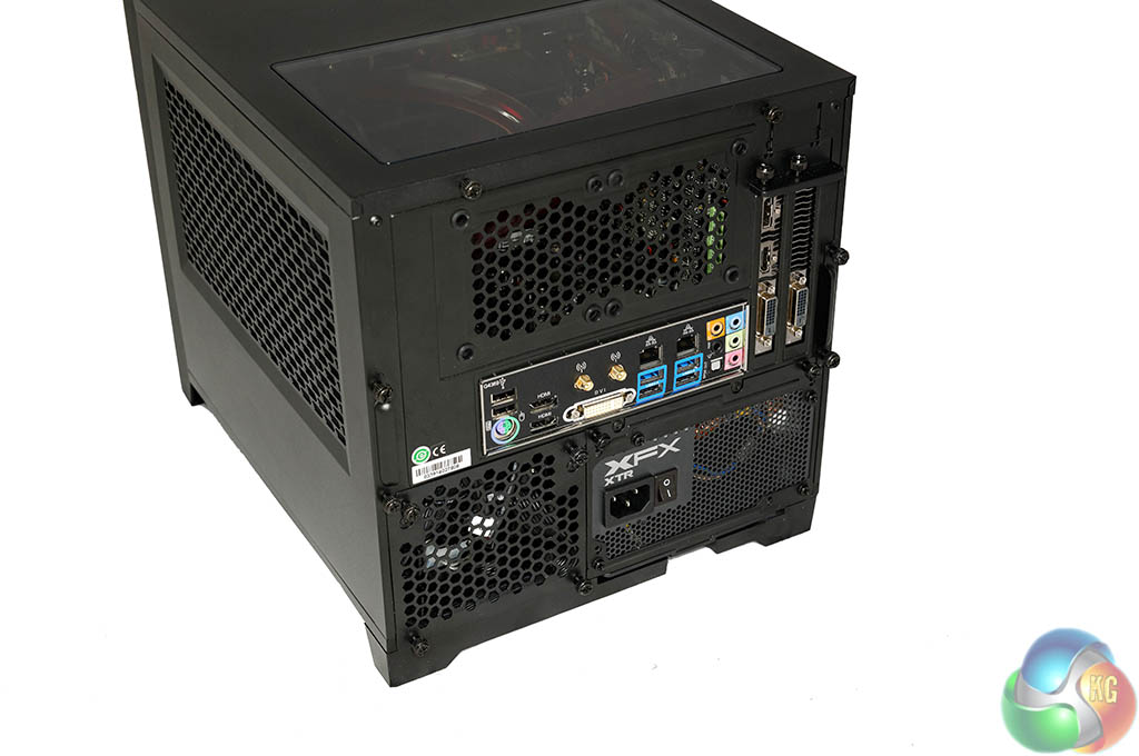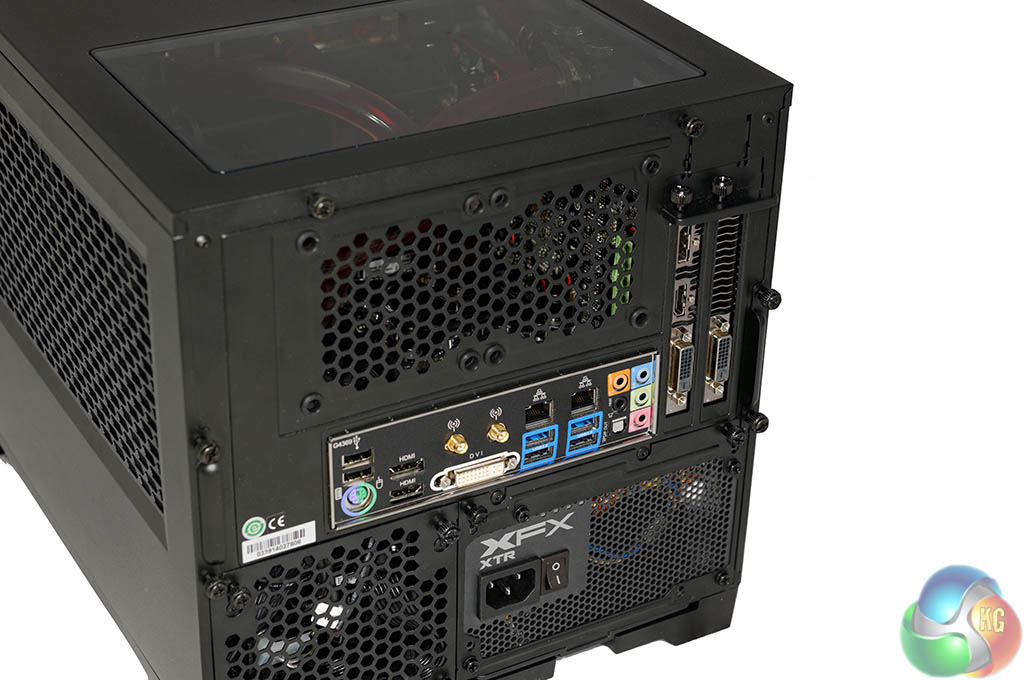 At the rear of the case we can see AWD are using an XFX XTR 650 watt power supply, installed at the bottom. None of the fan slots are populated at the rear, but we will look inside the case shortly. The AMD R9 290X graphics card is installed vertically at the side, so its important to note you don't connect the monitor to any of the integrated graphics connectors on the Gigabyte Z87N-Wifi motherboard.