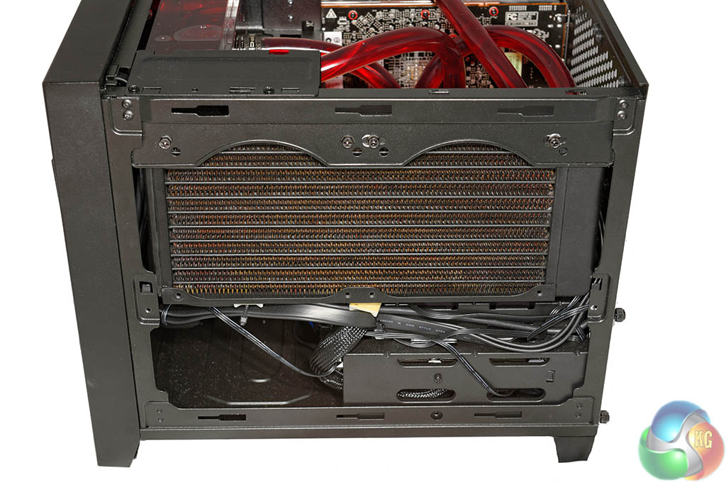 We removed all the 250D panels. One side exposes the custom XSPC liquid cooled R9 290X graphics card. The other side of the case is home to the 240mm radiator. All of the cables are pushed into the lower section of the chassis, hidden from view of the top window.