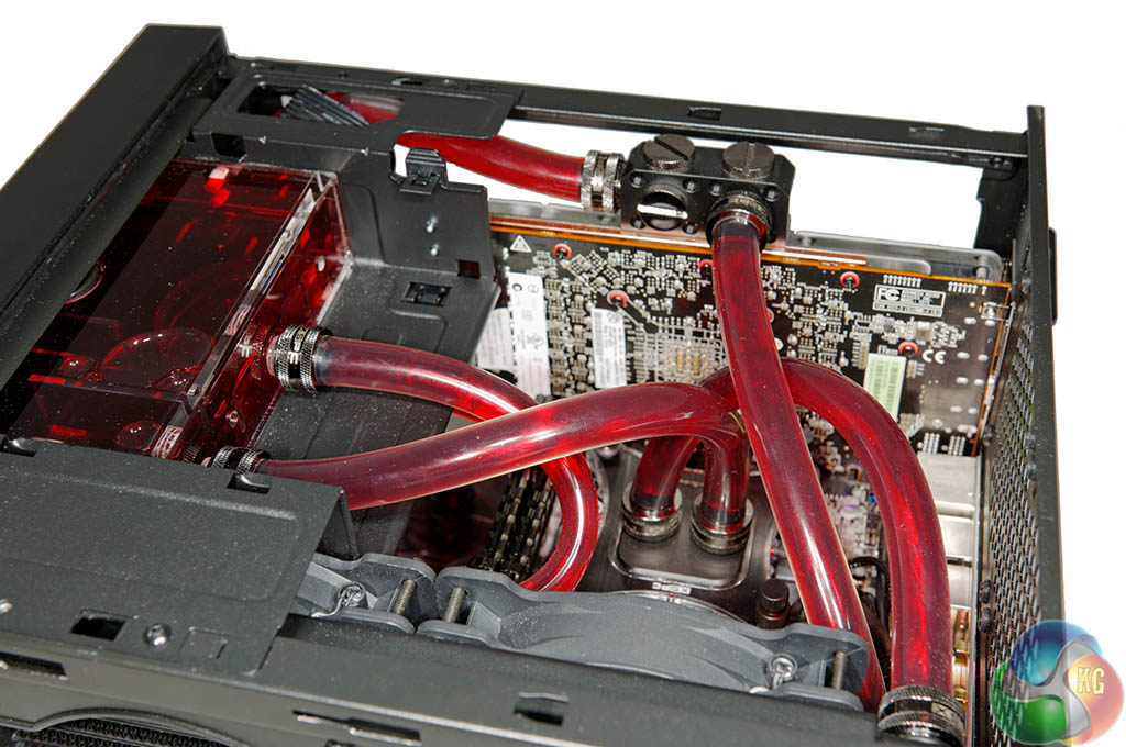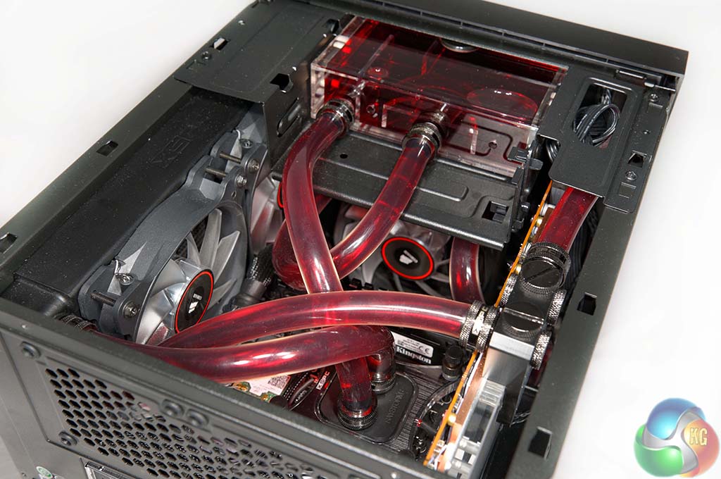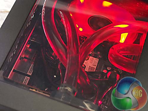A shot of the AWD Ignis Aqua 290X 250D Mini ITX PC system powered on. The red fan LED lights up the liquid. Its an attractive looking build.