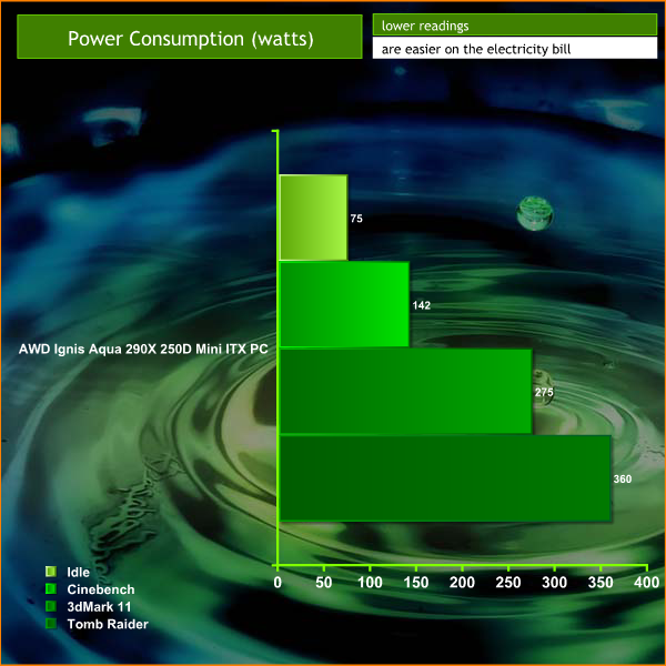 The system consumes 75 watts when idle. When gaming this can rise to 360 watts. AWD have selected an XFX 650W power supply for this system, so under full load, it will be running around 55% load – perfect for maximum efficiency.