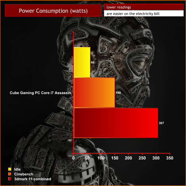 When idle, the system consumes around 60 watts at the socket. When the i7 4770K is running at 100% load, this rises to 150 watts. When running the combined test in 3Dmark11, the system hits 307 watts peak. The 800W power supply is more than enough for this load and shows potential on hand if you ever wanted to upgrade the video card for instance.