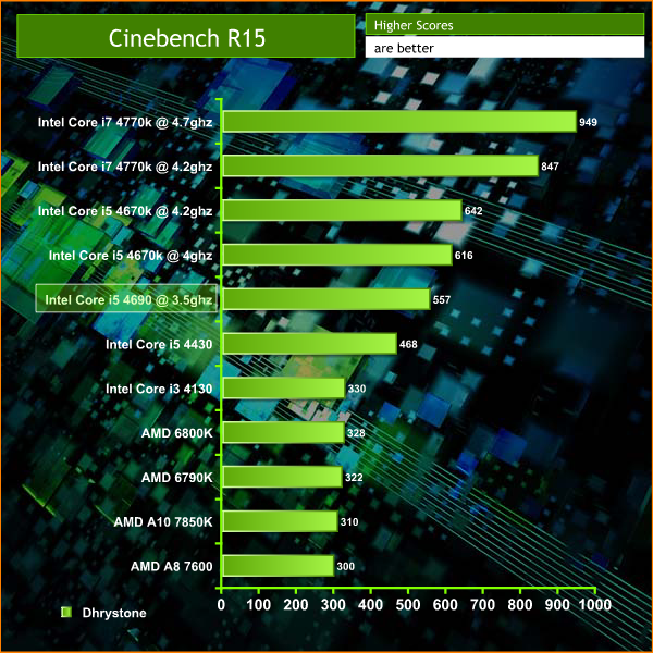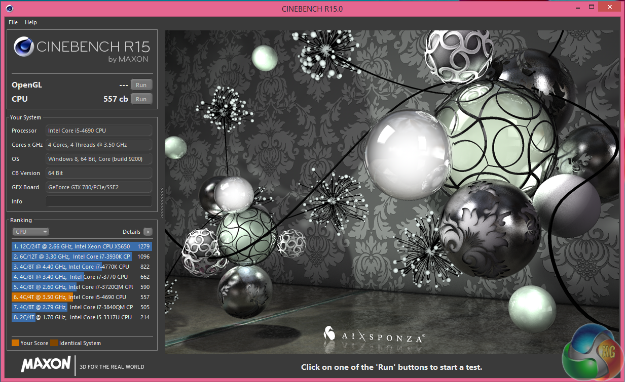 The final score of 557 points slots the reference clocked 4690 in between the 4670K @ 4ghz and the i5 4430 at reference clock speeds. A Core i5 processor is not the ideal first choice for intensive 3D duties.